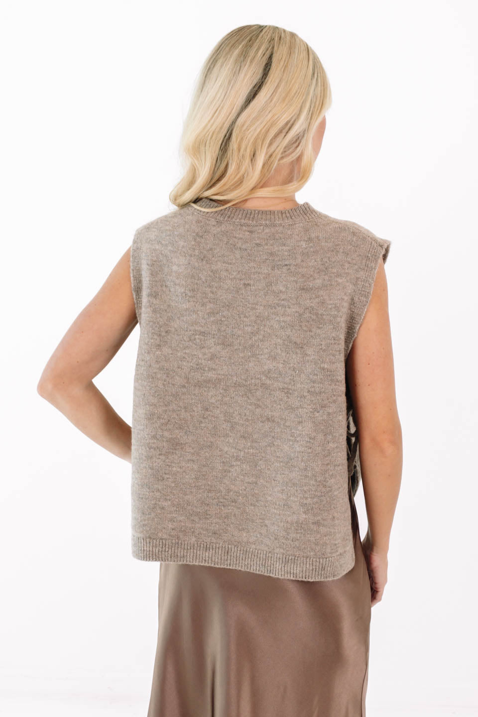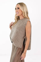 Cozy meets cool in this brown knit sweater vest with playful side ties and a modern asymmetrical hem. It’s the perfect layering piece that turns any outfit into an instant vibe. Soft, chic, and a little unexpected—just like your favorite fall latte.