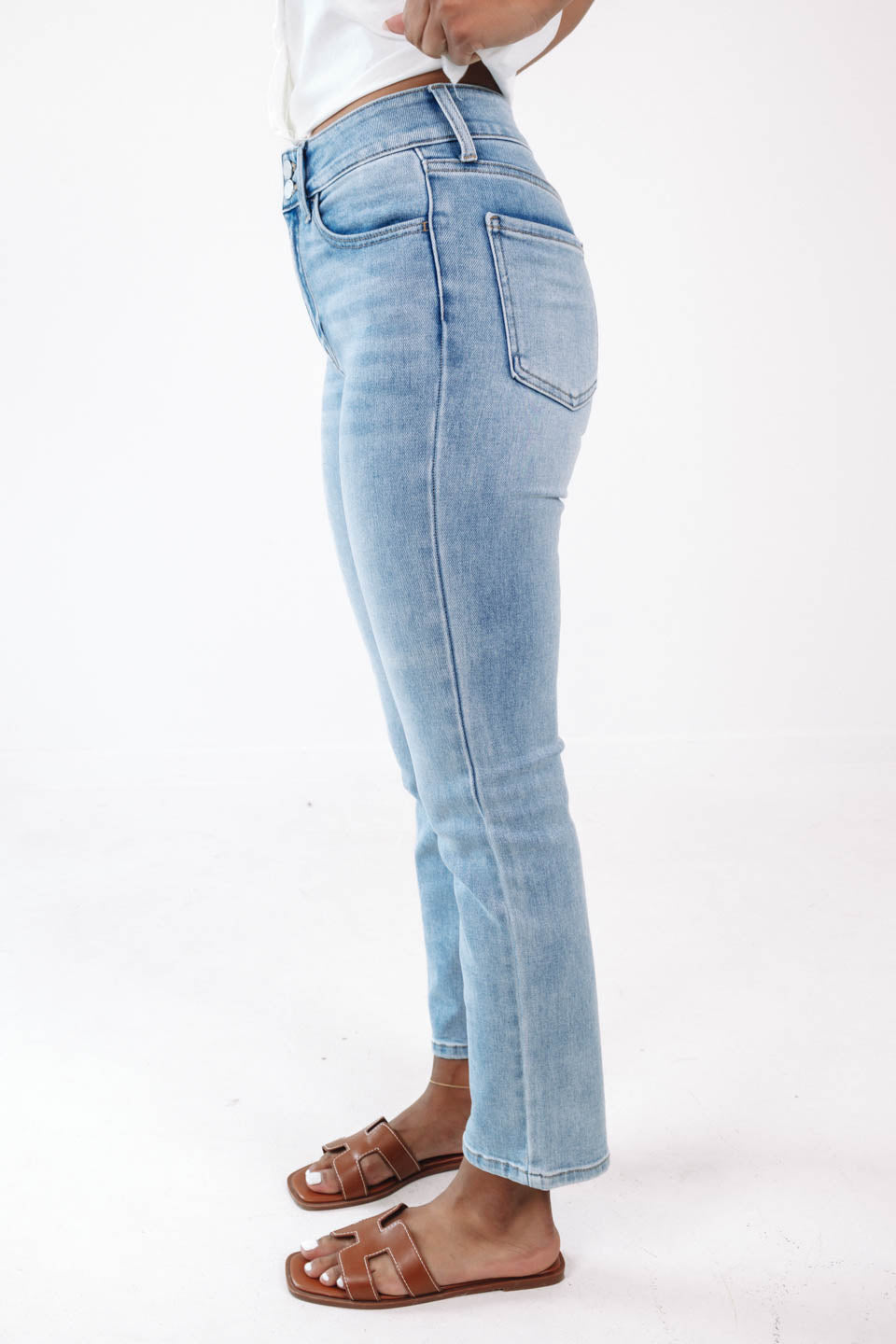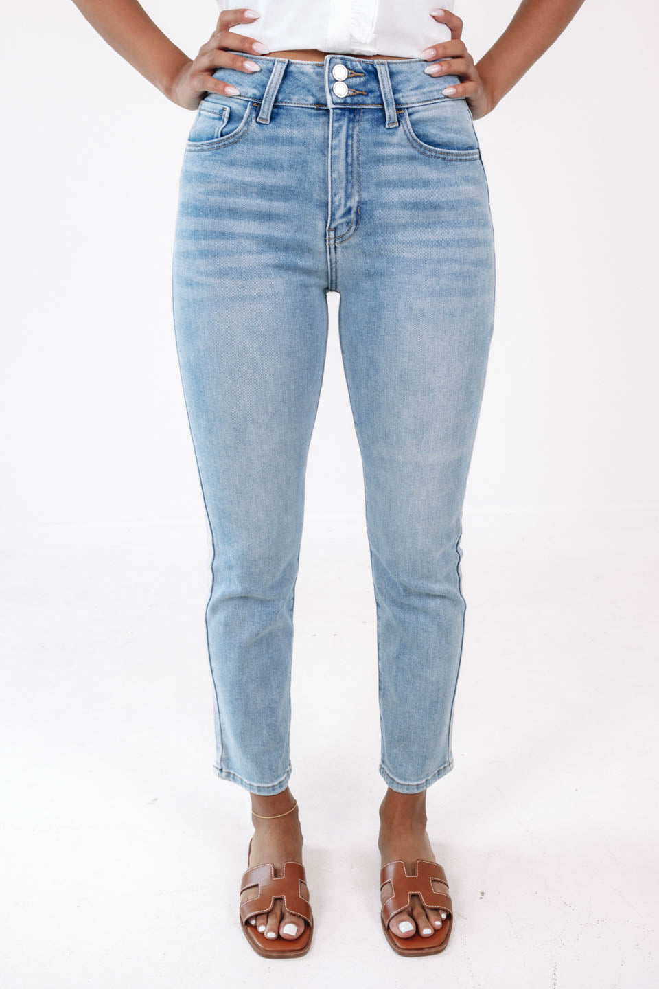 These light-wash jeans are your new wardrobe MVP, offering the perfect blend of comfort and style. With a flattering high-rise fit and a hint of stretch, they're ready for anything from brunch dates to weekend adventures. Pair them with your favorite top and you're good to go, turning heads wherever you roam!