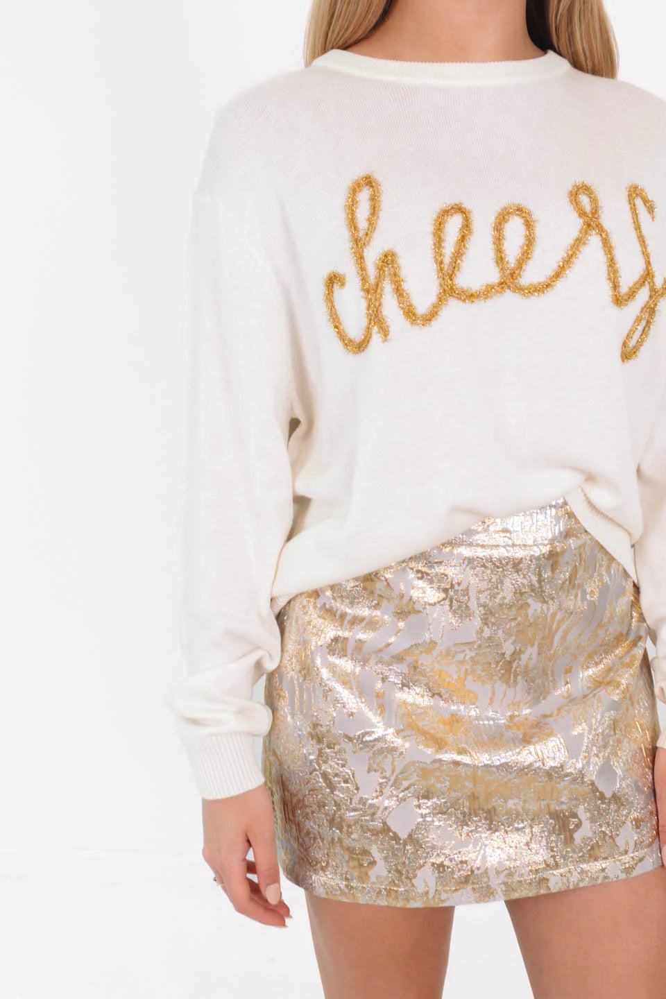 Make a statement with this shimmery floral skirt, featuring a vibrant mix of gold and silver accents on a metallic base. Perfect for adding a touch of glam to any outfit, it’s ideal for holiday parties and special occasions. Pair it with a simple top to let this showstopper skirt do all the talking!