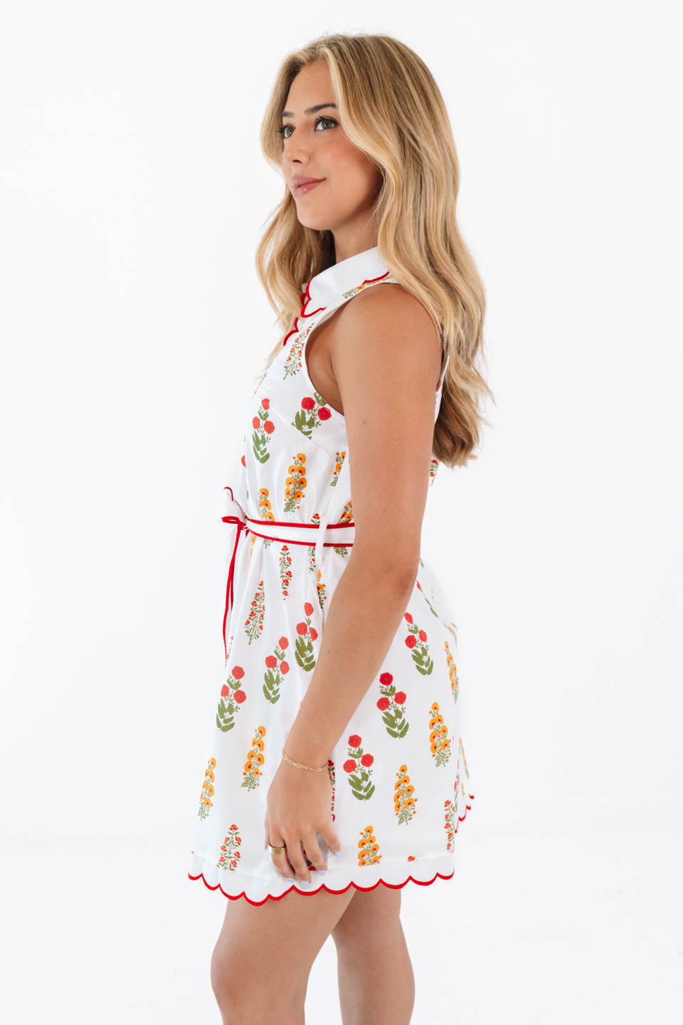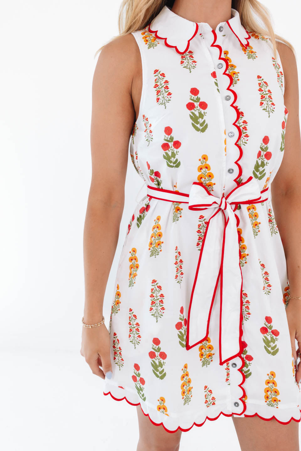 This sweet sleeveless dress is giving major garden party vibes with its floral print and scalloped trim! The red tie belt cinches the waist just right, adding a pop of charm to the breezy silhouette. With pockets to stash your sunnies or snacks, it's basically summer perfection in dress form!
