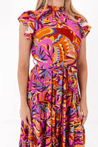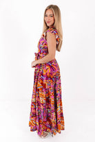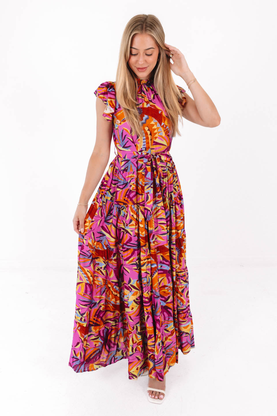 Bring the color wherever you go in this tropical daydream of a dress! With vibrant pinks, fiery oranges, and bold leafy prints, it’s made for twirling through beach towns or dancing under string lights. Flutter sleeves and a cinched waist add the perfect touch of flirty flair to this eye-catching maxi.