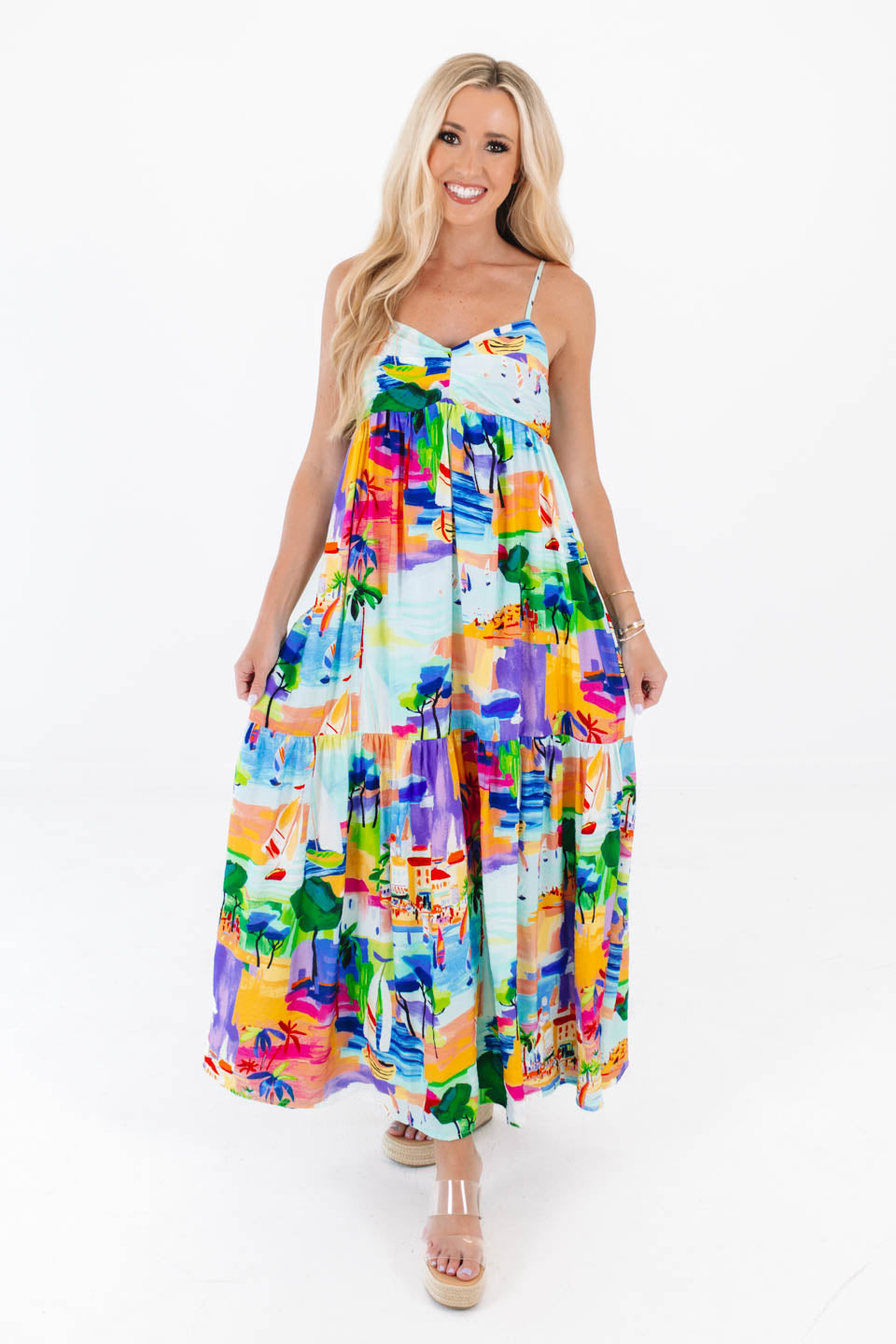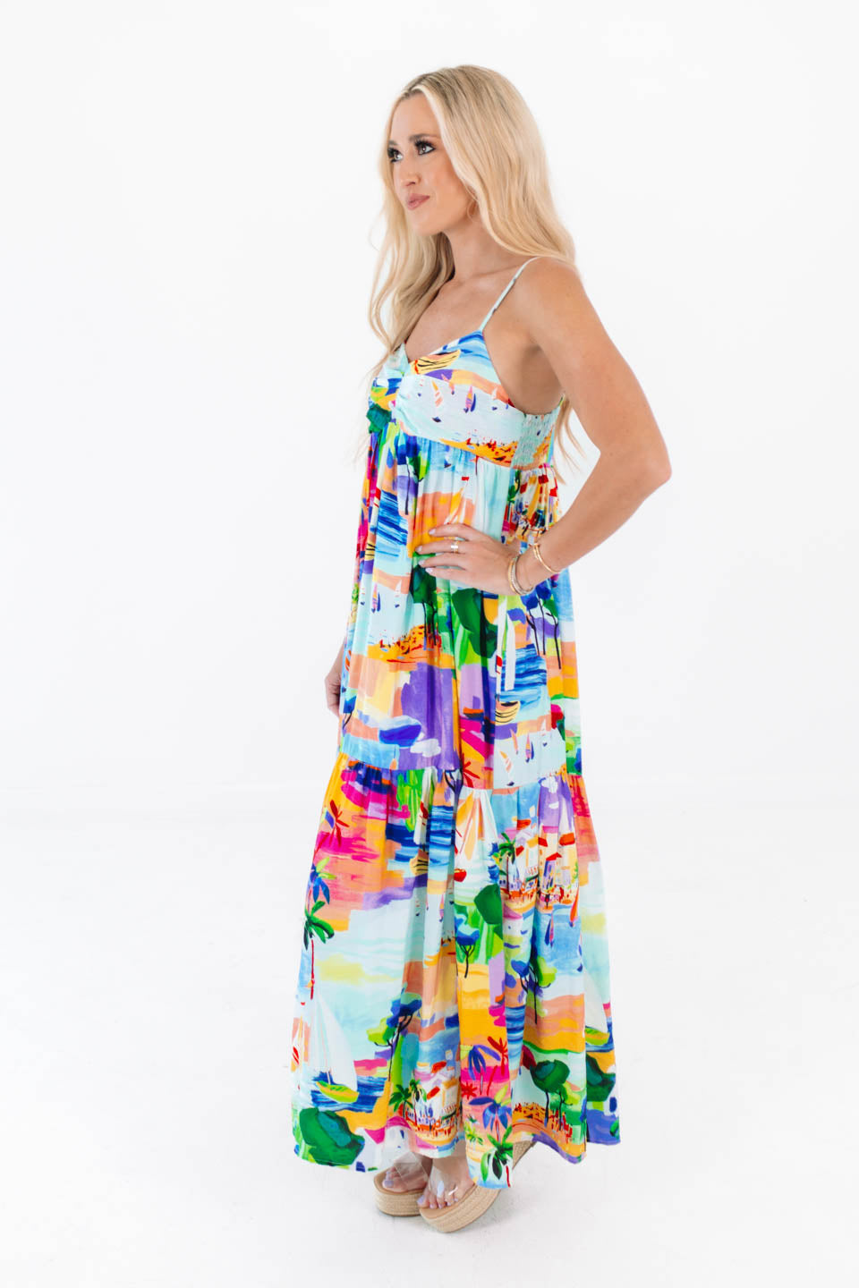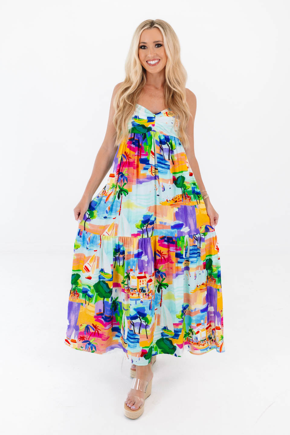 This dress is basically a vacation in clothing form—bright, breezy, and bursting with seaside charm! With a watercolor-inspired print of sailboats and palm trees, it’s made for twirling through tropical getaways or rooftop brunches. Slip it on and let the island vibes follow you wherever you go!
