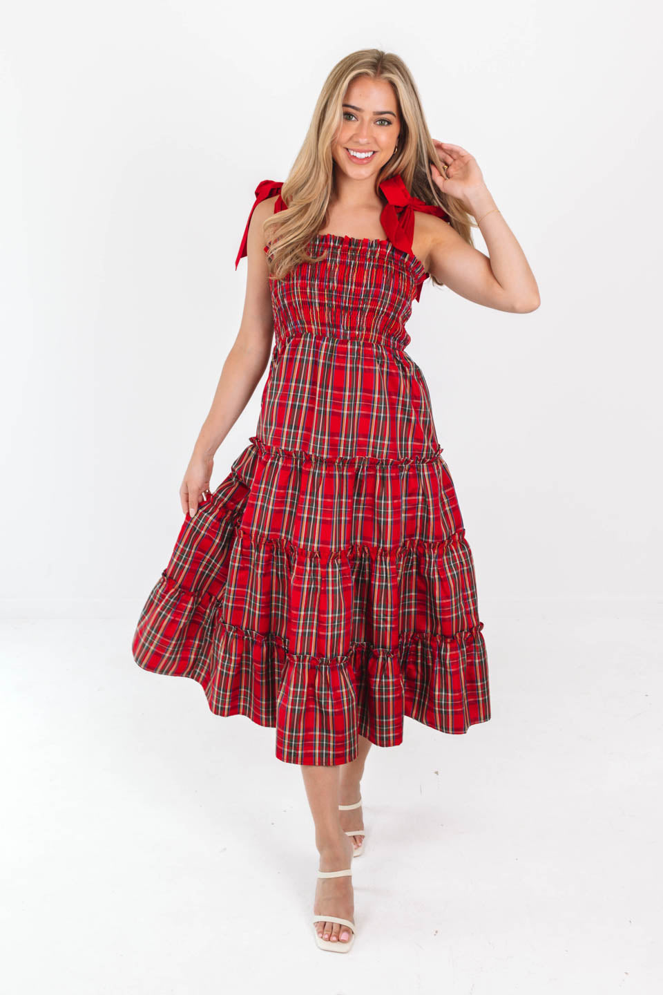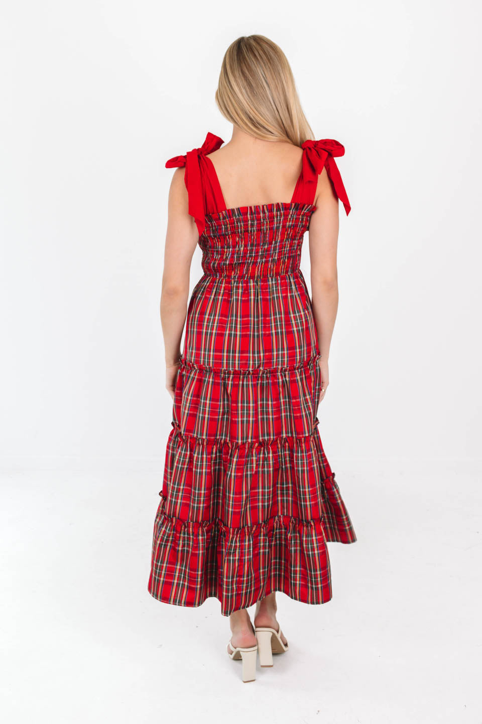 The Tamara Tie Strap Midi Dress - Red Plaid