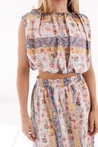 This cropped floral top is sweet, flirty, and full of retro charm. The billowy silhouette and smocked waist give it a relaxed, romantic feel that’s perfect for sunny days. Wear it with the matching skirt for a coordinated look or denim for easy weekend style!