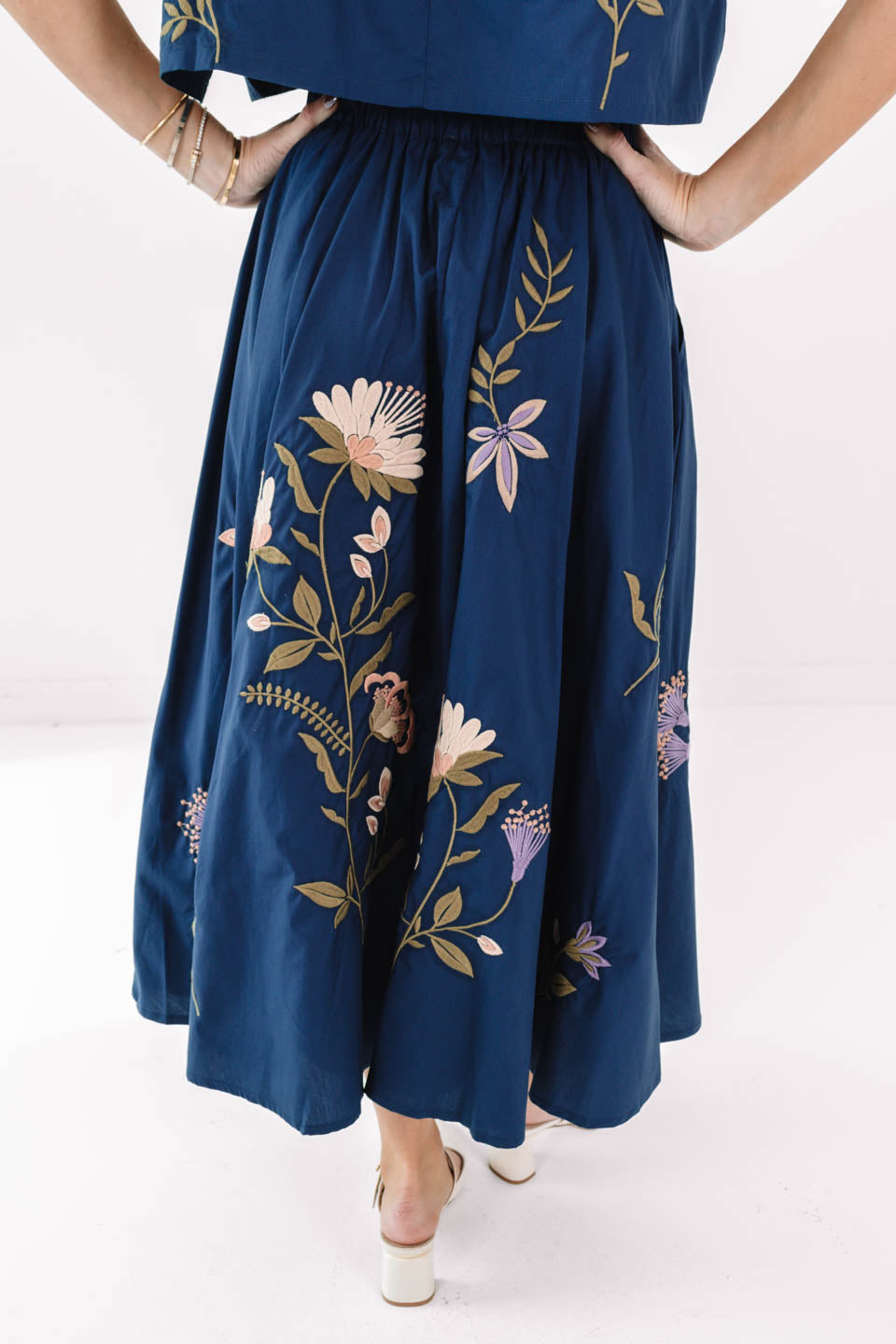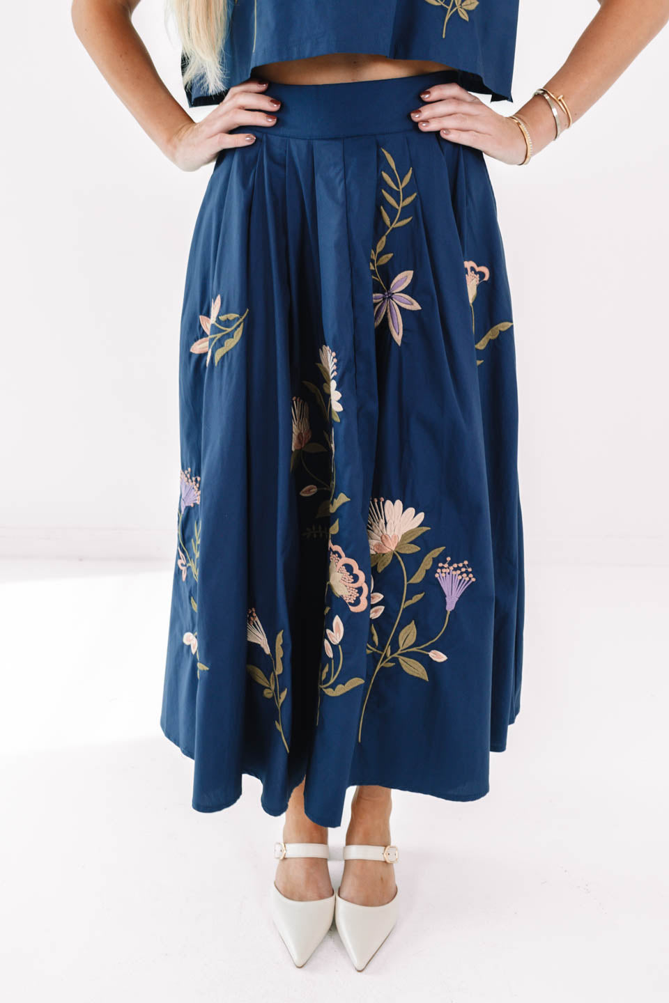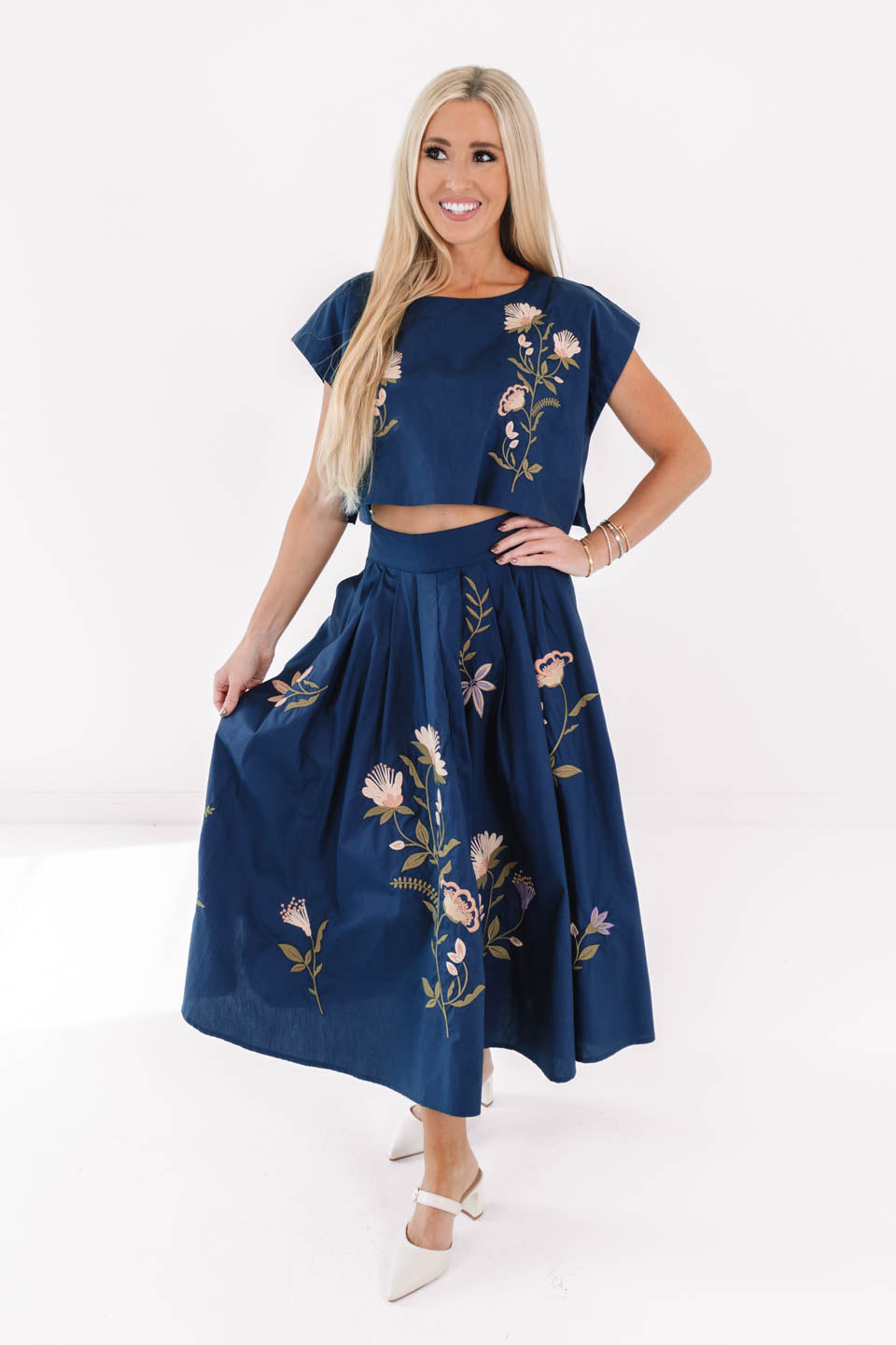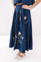 Flowy, floral, and fabulously feminine — this skirt is made for movement! The navy base lets the embroidered blooms pop, giving it that blooming with charm vibe. Pair it with the matching top for a coordinated look that’s equal parts graceful and fun!
