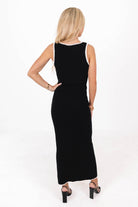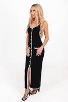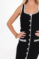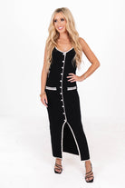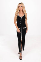 This sleek, knit dress is all about modern sophistication with a hint of vintage charm! The contrasting white trim and buttons give it a timeless, tailored vibe, while the front slit adds just the right amount of edge. Perfect for a chic day-to-night look, this dress is a standout for any occasion!