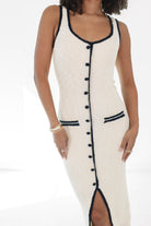 This sleek, knit dress is all about modern sophistication with a hint of vintage charm! The contrasting black trim and buttons give it a timeless, tailored vibe, while the front slit adds just the right amount of edge. Perfect for a chic day-to-night look, this dress is a standout for any occasion!