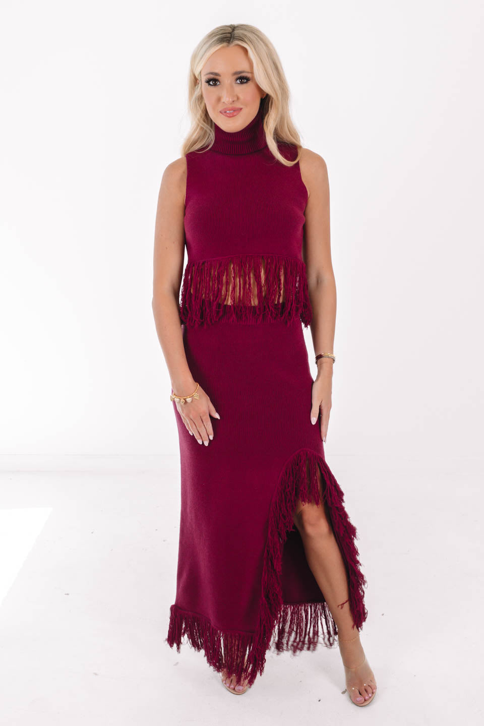 This striking set brings all the drama with its high-neck, fringe-trimmed top and matching skirt with a sassy side slit. The fringed detailing adds movement and flair, making it perfect for turning heads at any event. Whether you're out for a night on the town or attending a stylish soirée, this ensemble is sure to make a statement!