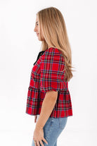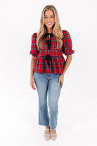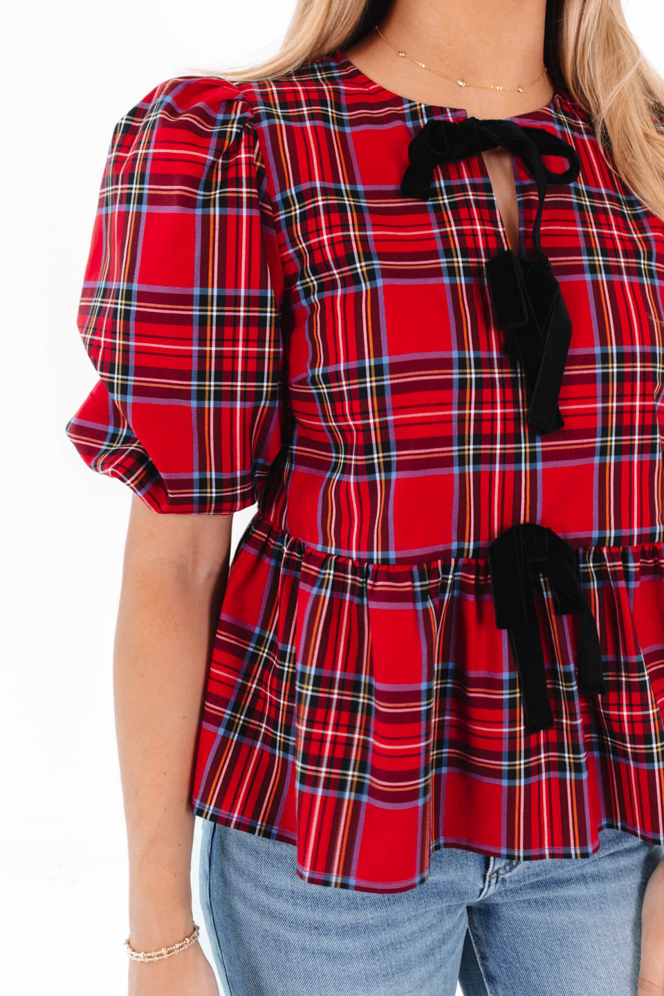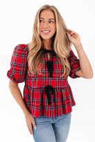 Add a festive touch to your holiday wardrobe with this red plaid tie top, designed with a darling bows and puff sleeves. The cheerful plaid and graceful accents add a classic, seasonal charm - perfect for joyful gatherings and twinkling holiday moments. Pair with our Hollin Skort for the perfect holiday look!