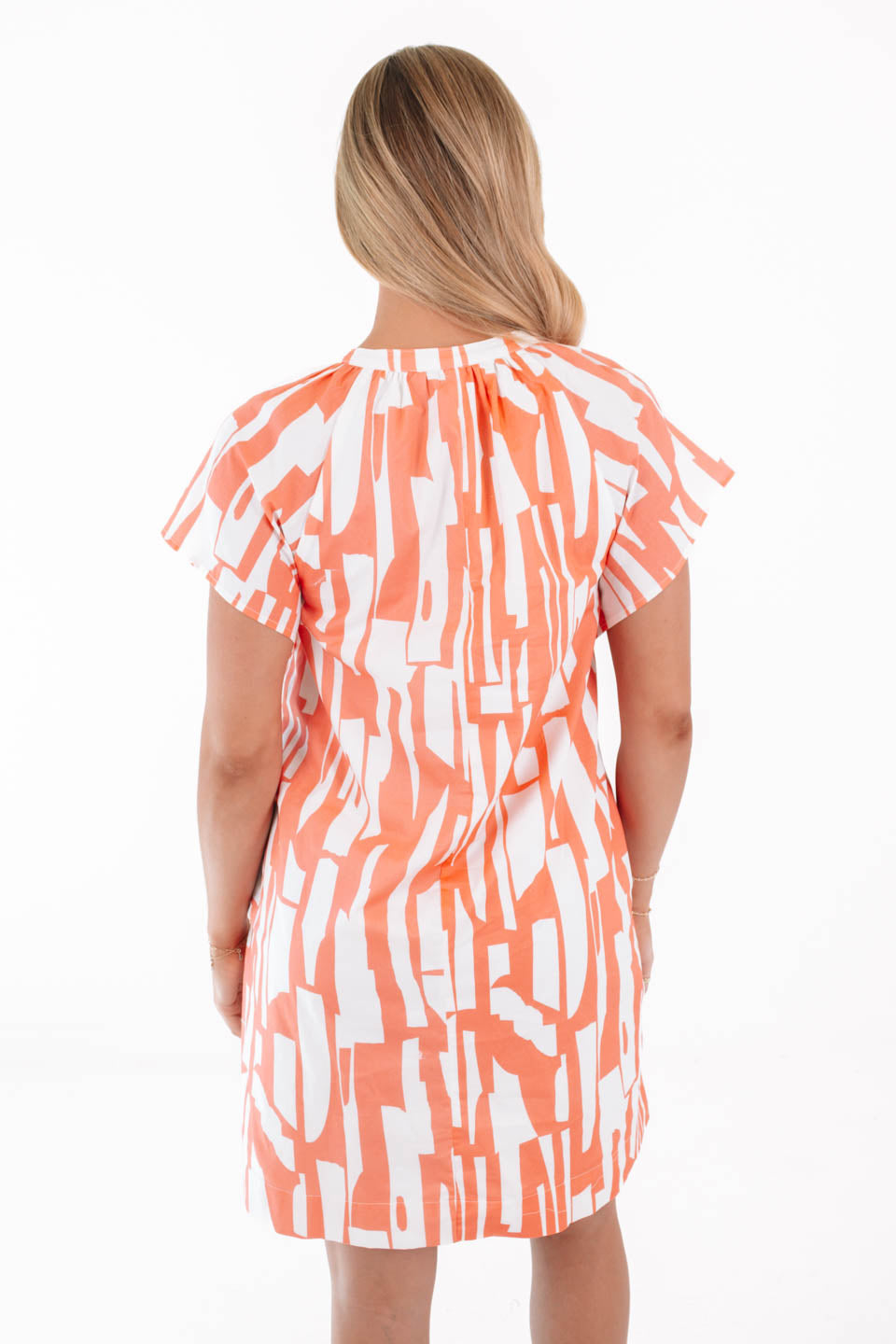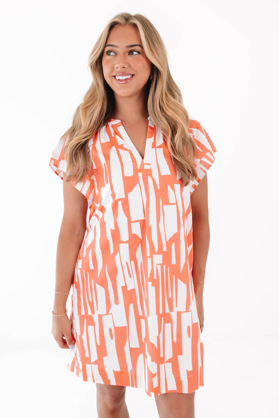 This breezy coral-and-cream dress is your new go-to for effortless chic—whether you're beach-hopping or brunching. The bold abstract print brings the energy, while the loose fit and handy pockets keep it cool and comfy. Pair it with strappy sandals and a sunny smile, and you're basically walking vacation vibes!