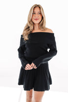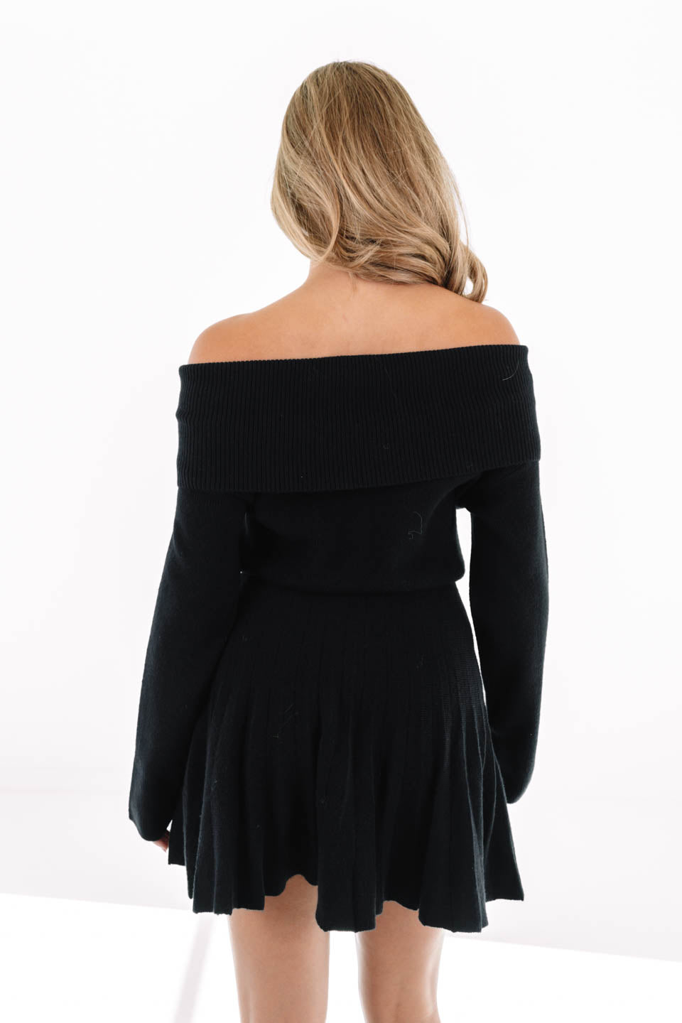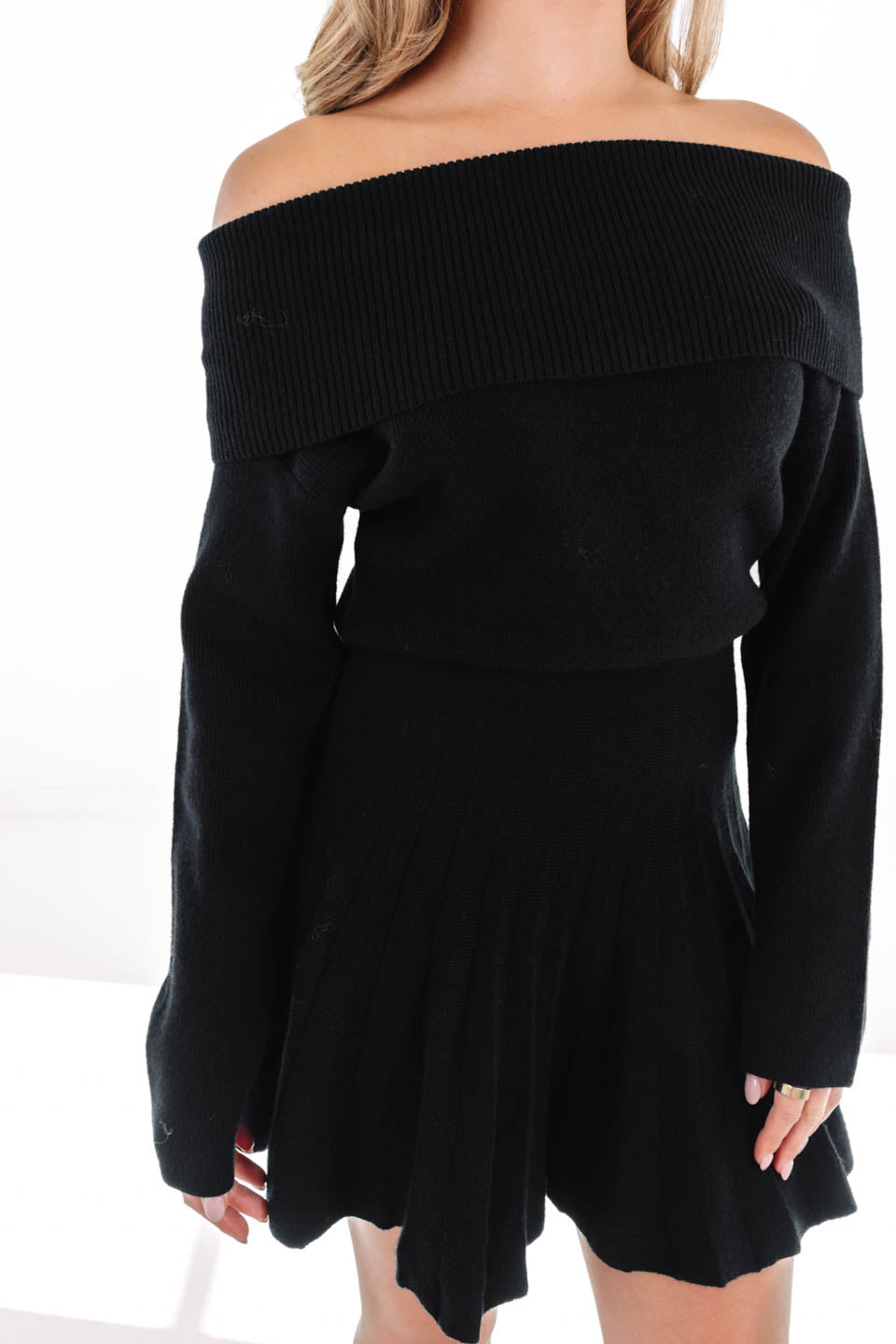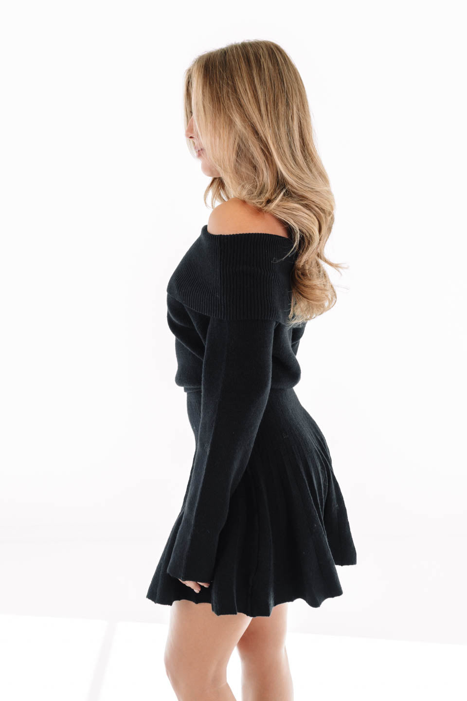 This off-the-shoulder knit dress is cozy meets classy in the best way. The soft ribbed texture and flirty pleated skirt make it perfect for brunch dates or fireside nights. Effortless, flattering, and a little bit flirty—this one’s your new cold-weather crush.