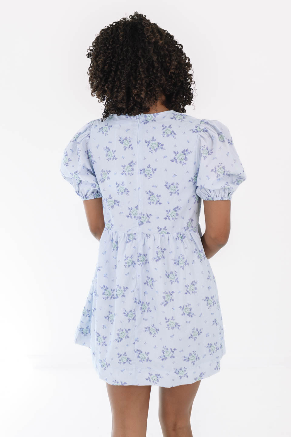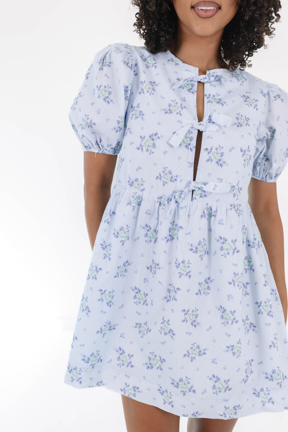 Sweet and charming, this baby blue floral dress with puff sleeves is perfect for brunch with the girls or a romantic picnic in the park. The delicate bow details add a touch of vintage flair, making it effortlessly chic. Pair it with dainty jewelry and sandals for a dreamy, feminine look.