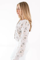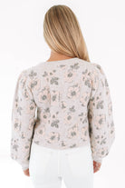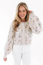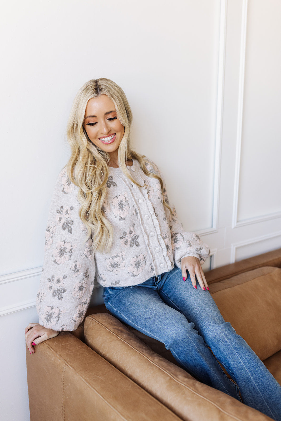 Soft, sweet, and oh-so-cozy, this floral sweater is giving major “hot cocoa by the fire” energy. The textured blooms and puff sleeves add a touch of vintage charm that’s perfect for chilly days. Pair it with your favorite jeans and fuzzy socks for a look that’s effortlessly winter-chic!