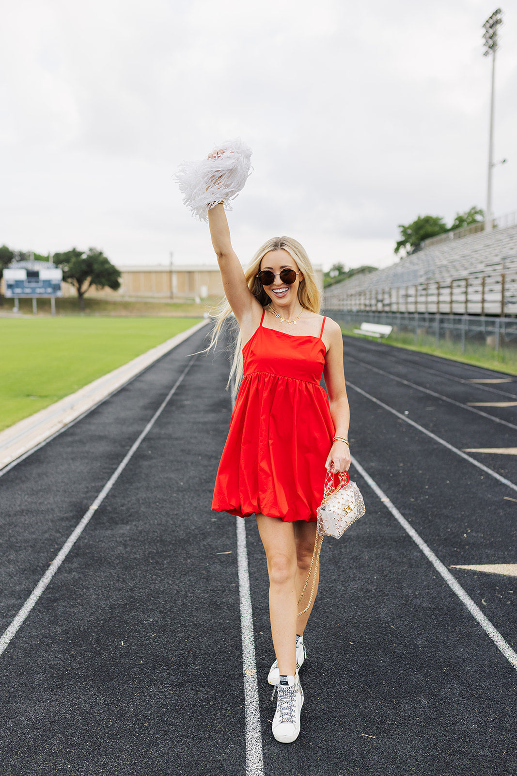 Bring the energy to campus in this bold bubble-hem mini that’s made for tailgates and touchdowns! The deep red hue screams school spirit, while the flirty fit keeps you game day ready from kickoff to post-win pics. Pair it with white boots and you're officially the MVP of college style!