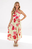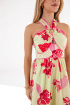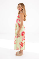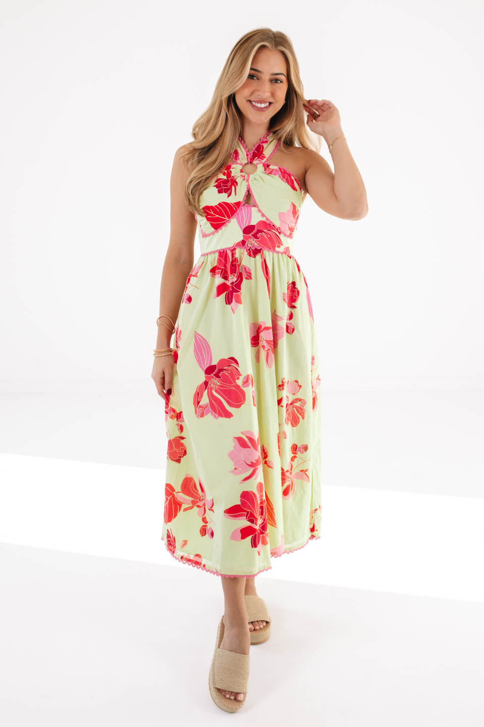This charming green midi dress features a soft pink floral print, bringing a fresh and feminine feel to your wardrobe. With ric rac detail adding a playful touch, front cross straps create a flattering sun-kissed look, while the back zipper ensures a sleek fit. Perfect for a spring outing or special occasion, this dress combines style and comfort effortlessly.