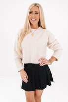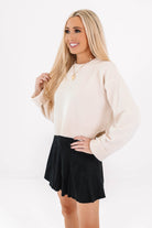 This soft cream sweater is sweet, chic, and just the right amount of cozy. With its cropped cut and ribbed hem, it’s perfect for pairing with high-waisted jeans or a flowy skirt. A dreamy blend of casual comfort and flirty fun, it’s the sweater you’ll reach for again and again!