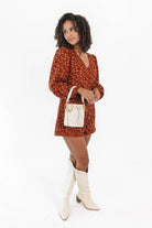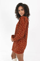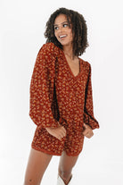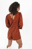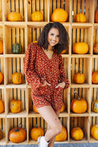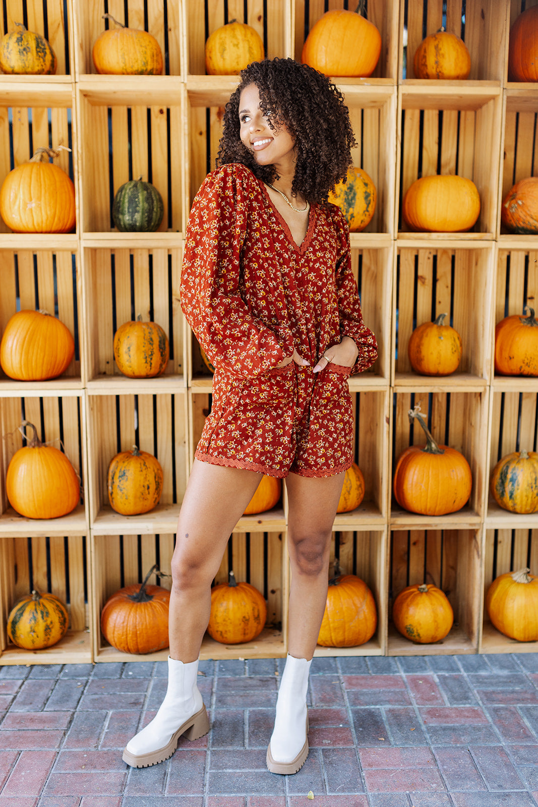 This adorable rust-red romper with dainty floral prints is perfect for embracing autumn vibes in style! With its long sleeves and flattering V-neck, it's a comfy yet chic one-piece that’s ready for anything from pumpkin patches to brunch dates. The best part? It has pockets, making it as practical as it is cute!