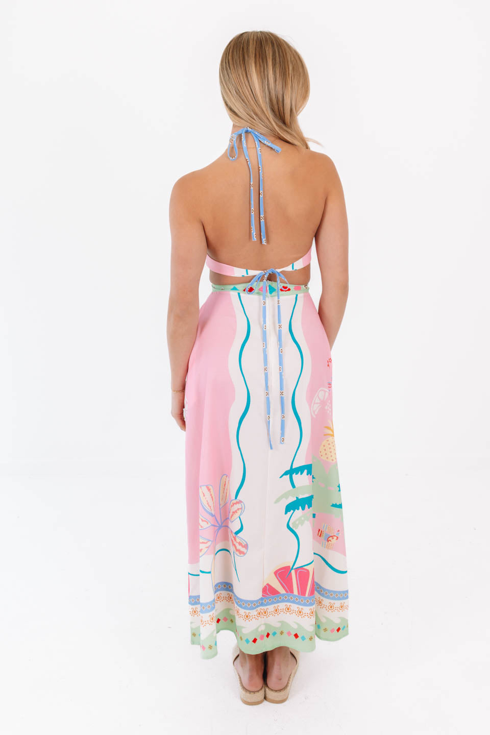 Step into a tropical daydream with this vibrant, pastel maxi dress that’s bursting with vacation vibes! The playful mix of soft pinks, greens, and blues, along with the whimsical prints of pineapples and florals, makes this a sunshine-ready statement piece. Whether you're strolling through a resort or sipping cocktails by the beach, this dress is pure paradise in fabric form!