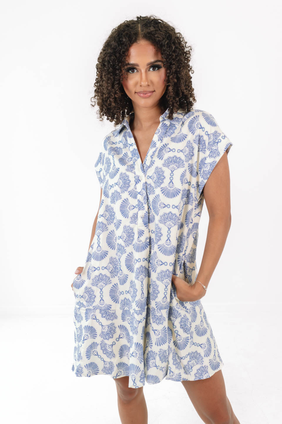This dress is a seaside daydream—light, breezy, and sprinkled with a playful shell print that whispers summer elegance. The relaxed, flowy cut and polished collar make it equally perfect for beach strolls or sipping rosé al fresco. And yes, it has pockets—because fabulous and functional is always in style!