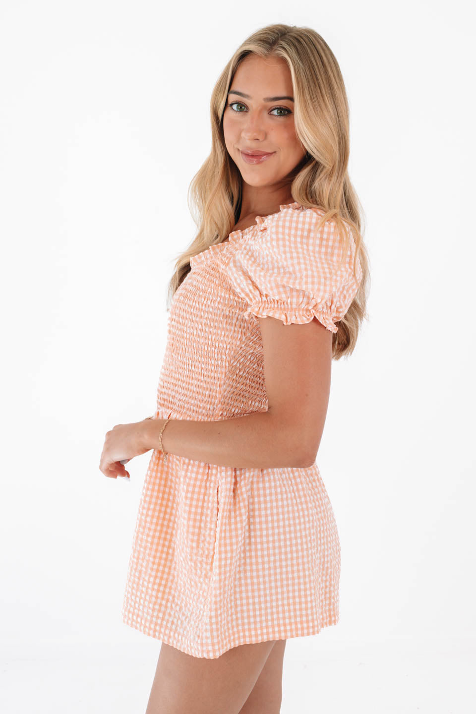 This orange gingham romper is a sweet slice of summertime joy! With its smocked bodice, puff sleeves, and playful fit, it’s made for twirling through picnics or brunch dates. Just add sunshine and your favorite sandals for instant cuteness overload.