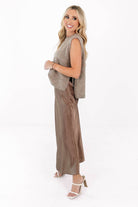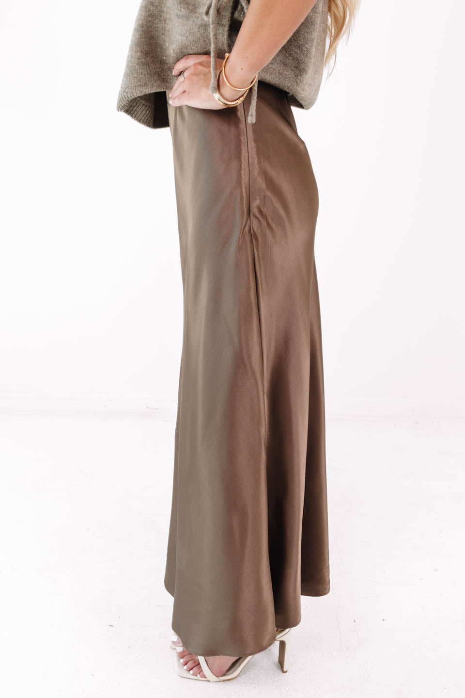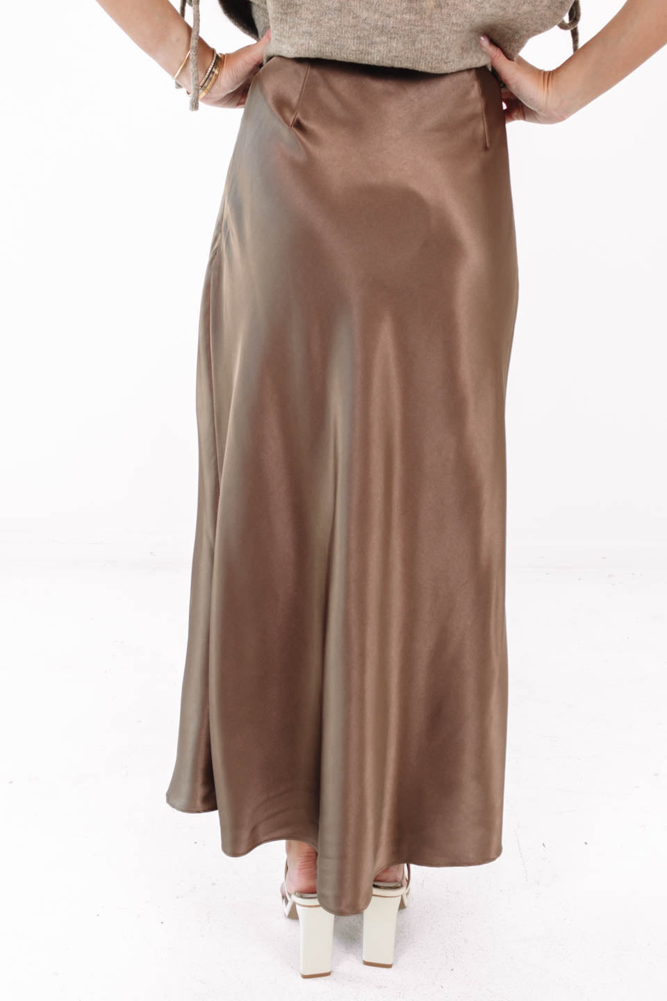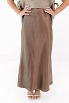Slip into sleek sophistication with this brown satin midi skirt that moves like magic. The glossy finish gives just the right touch of glam for both casual brunches and candlelit dinners. It’s the kind of skirt that says, “I woke up like this,” but fashionably flawless.