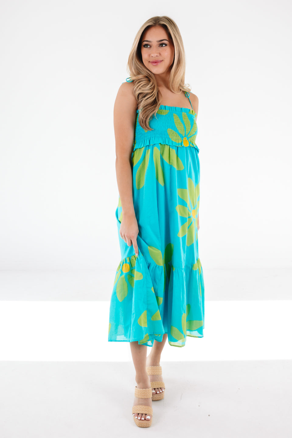 Step into a summer dream with this breezy blue dress, adorned with vibrant green floral patterns that bring a burst of nature's charm. Perfect for a beachside brunch or a casual day out, its flowy design and adjustable straps offer both comfort and style. Pair it with your favorite sandals and a sunhat to complete the ultimate sunny-day ensemble!