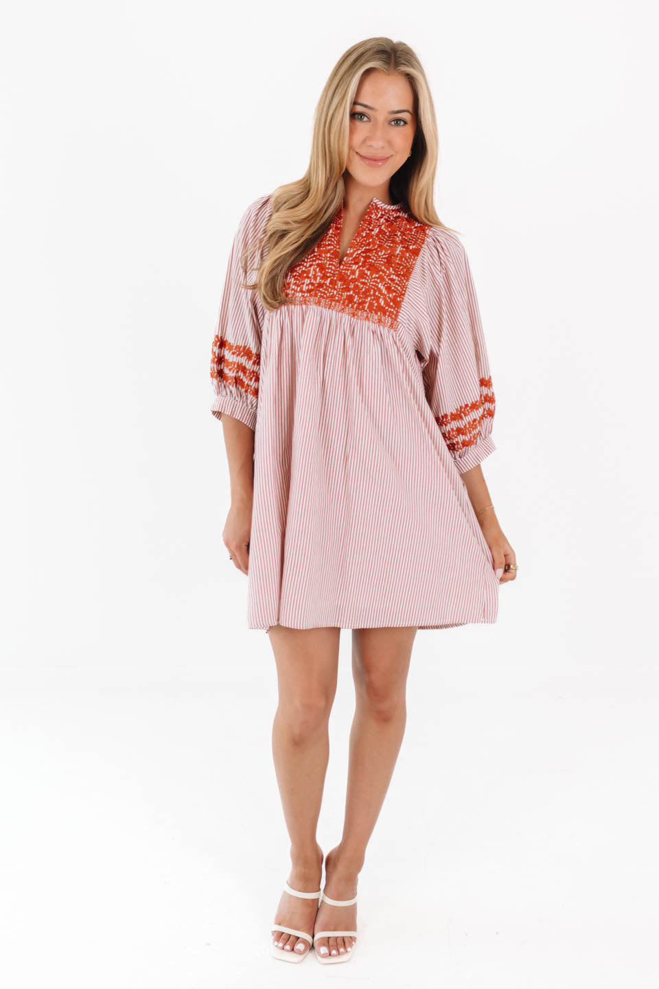 This dress is your go-to for tailgates, touchdowns, and turning heads! With bold orange embroidery and breezy stripes, it’s perfect for showing off school spirit in style. Pair it with boots and your game face — it’s time to rally!
