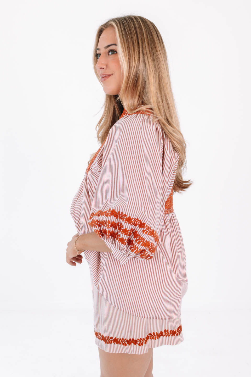 This breezy striped blouse is giving major campus cool with a touch of boho flair! The bold orange embroidery across the chest and sleeves adds just the right amount of team spirit. Whether you're heading to class or a tailgate, this top brings the vibes.