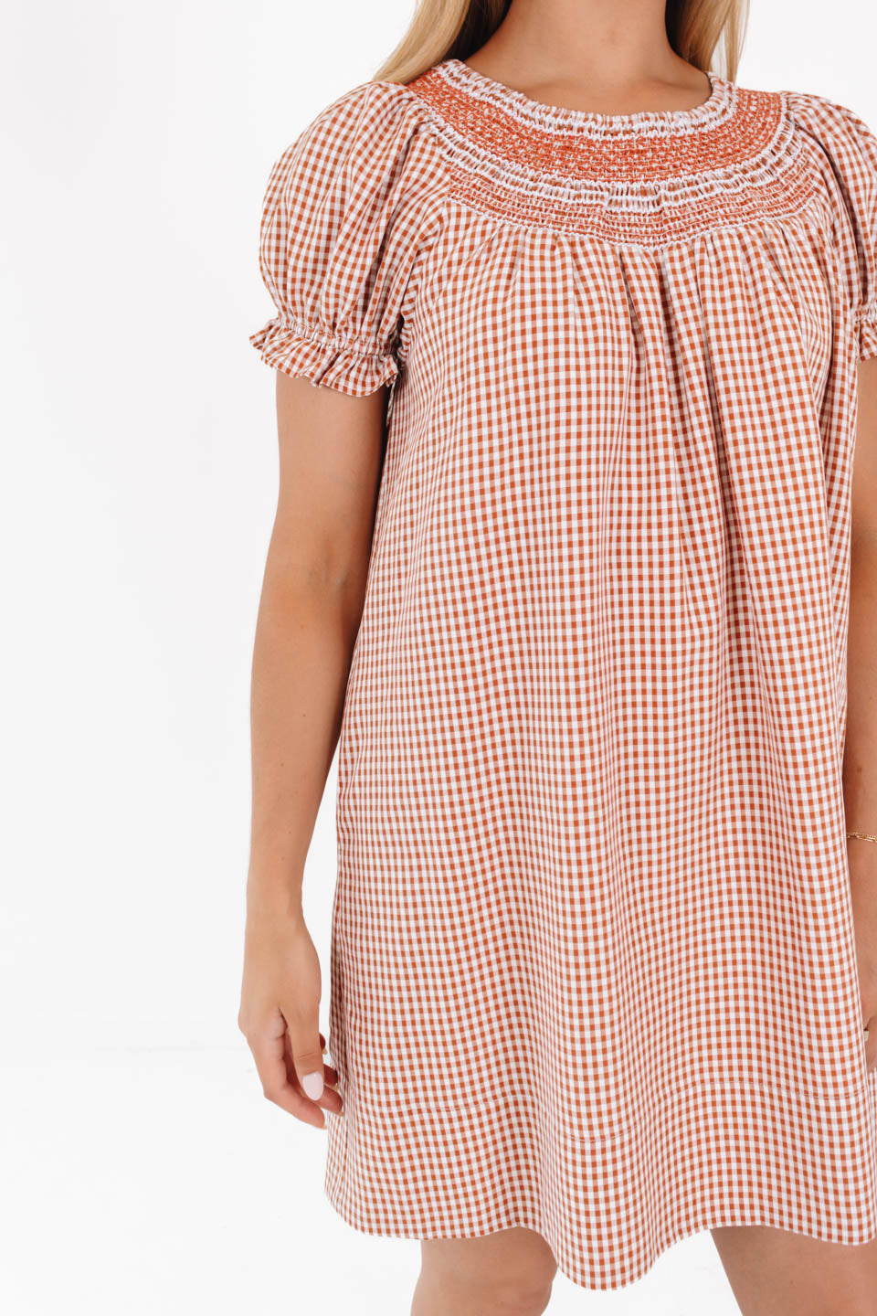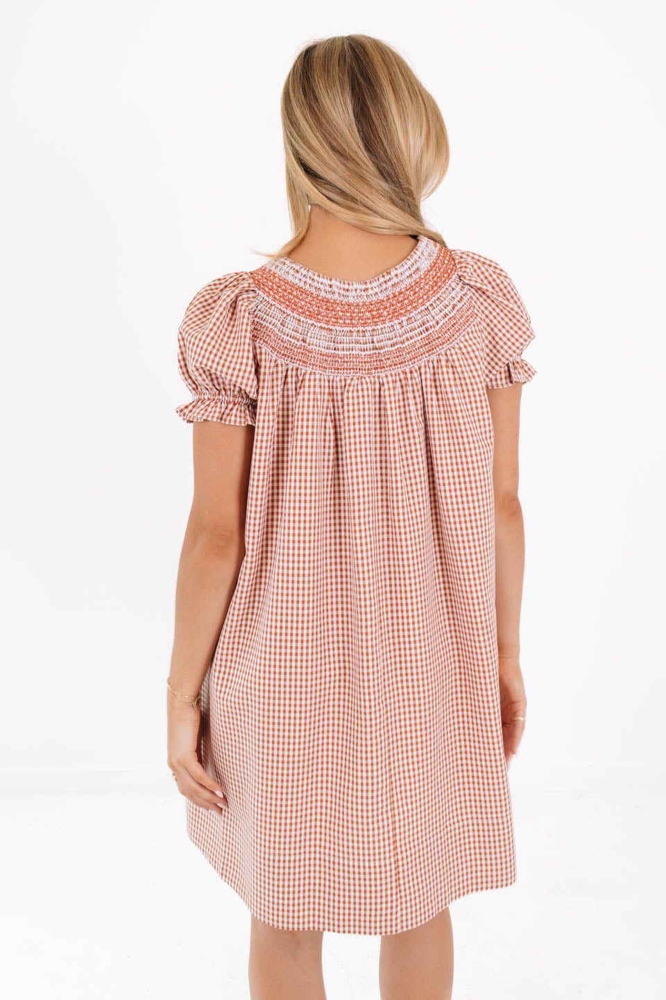 Bring the charm to campus in this gingham cutie that's perfect for cheering on your team in comfort and style! The smocked neckline and puff sleeves give it a playful, preppy vibe that's ready for tailgates or lunch on the quad. Just add sneakers or boots, and you're officially game day goals!