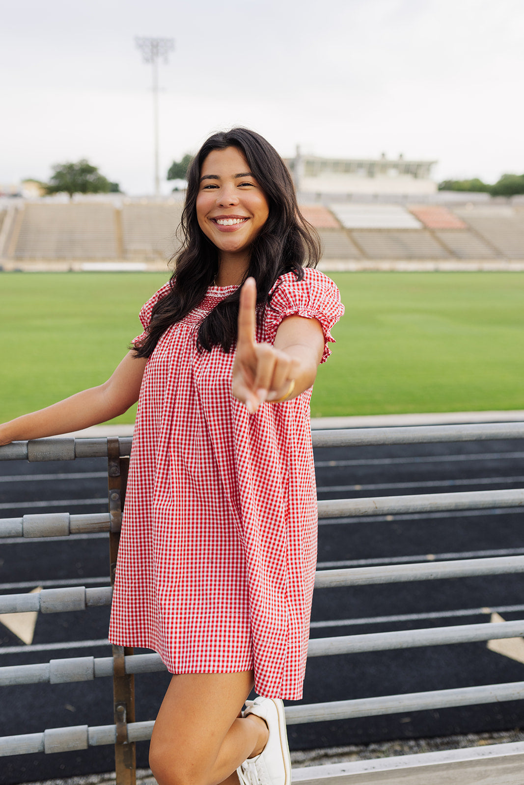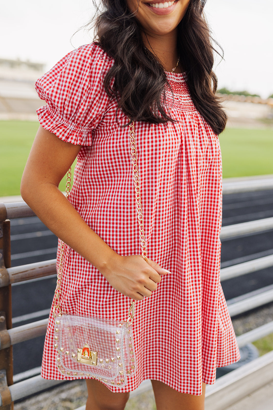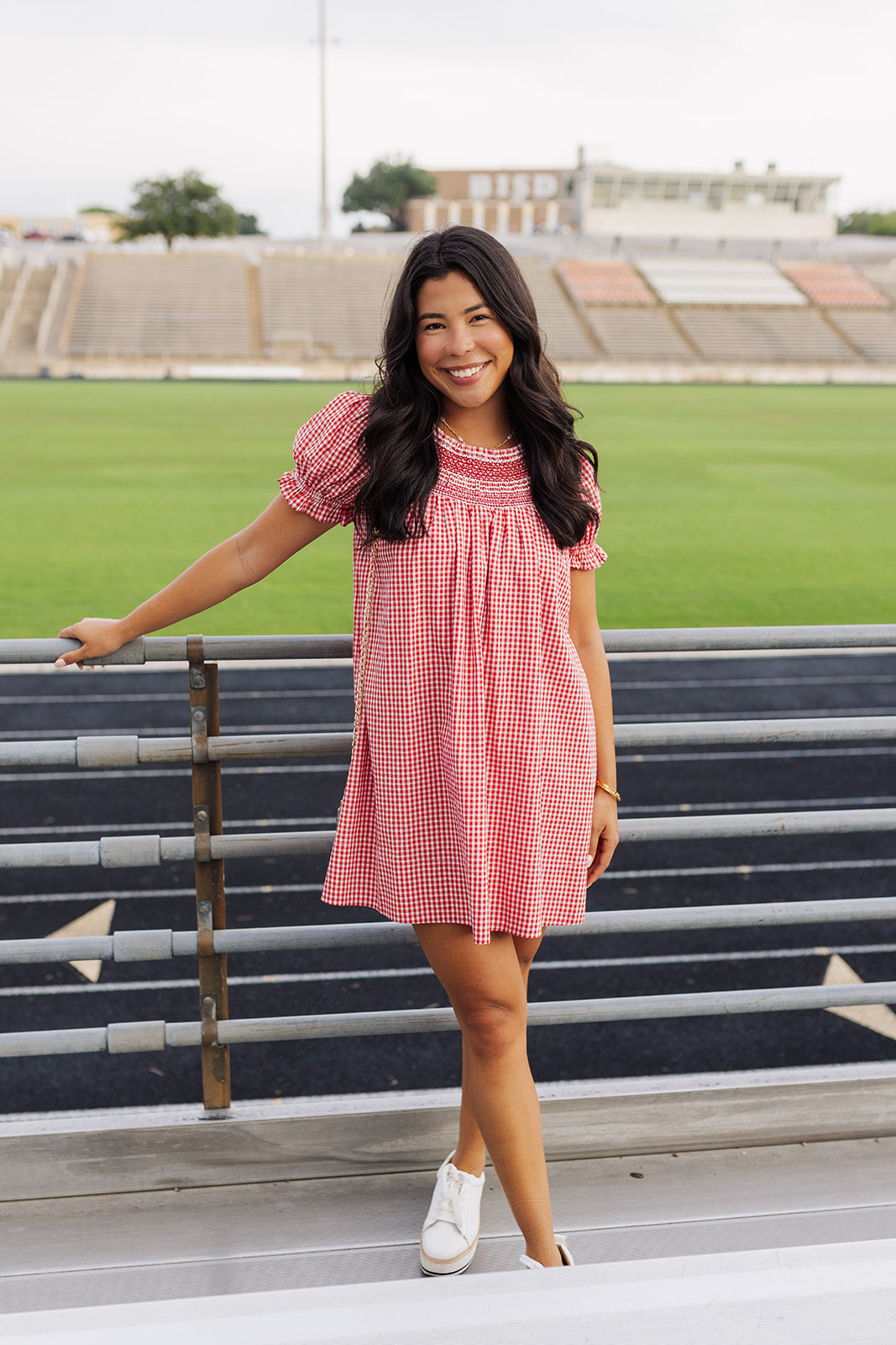 Bring the charm to campus in this gingham cutie that's perfect for cheering on your team in comfort and style! The smocked neckline and puff sleeves give it a playful, preppy vibe that's ready for tailgates or lunch on the quad. Just add sneakers or boots, and you're officially game day goals!