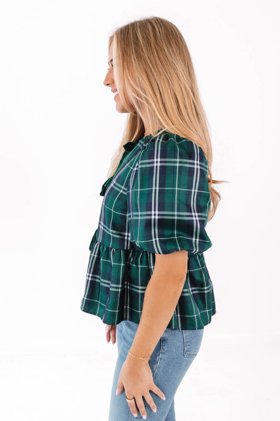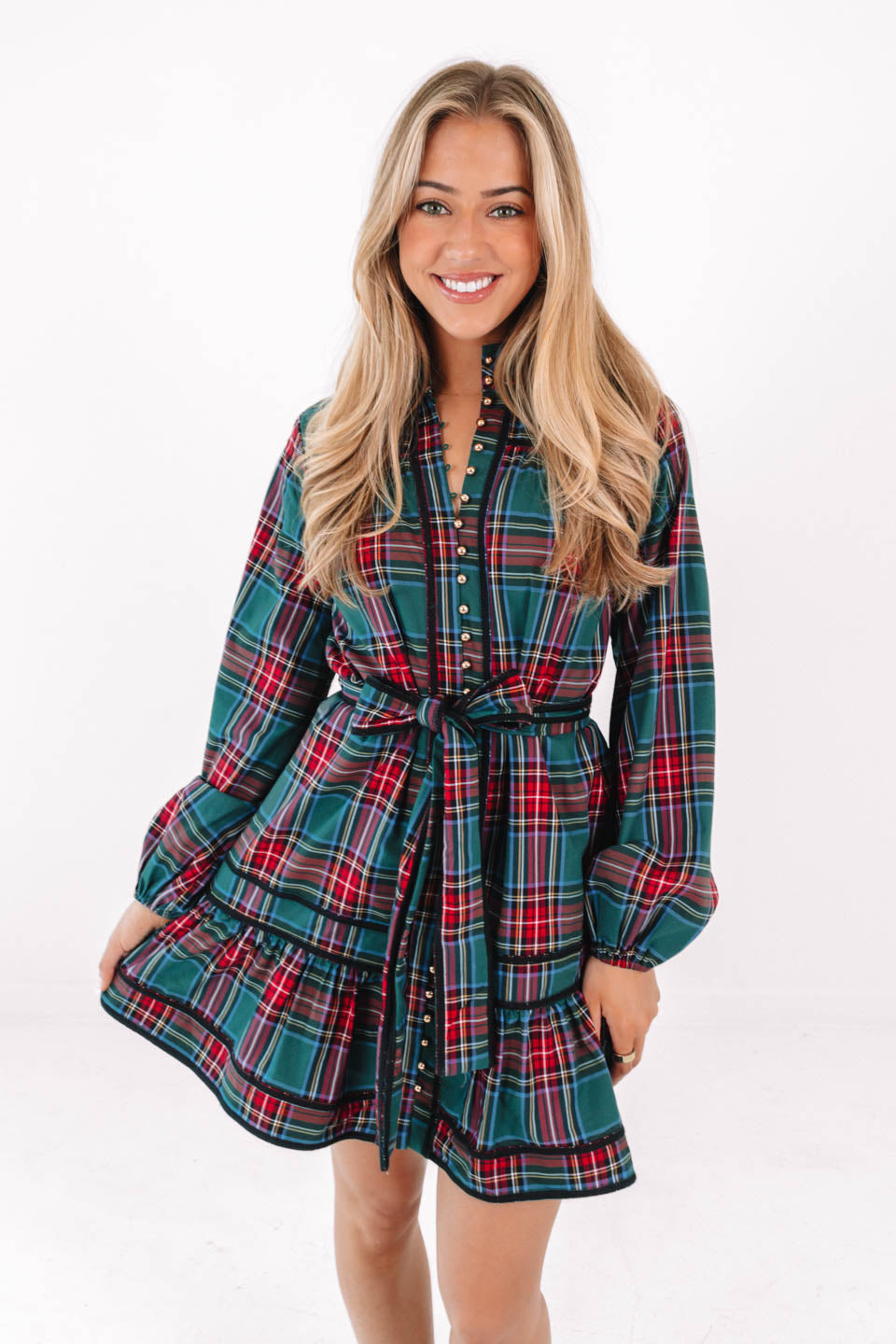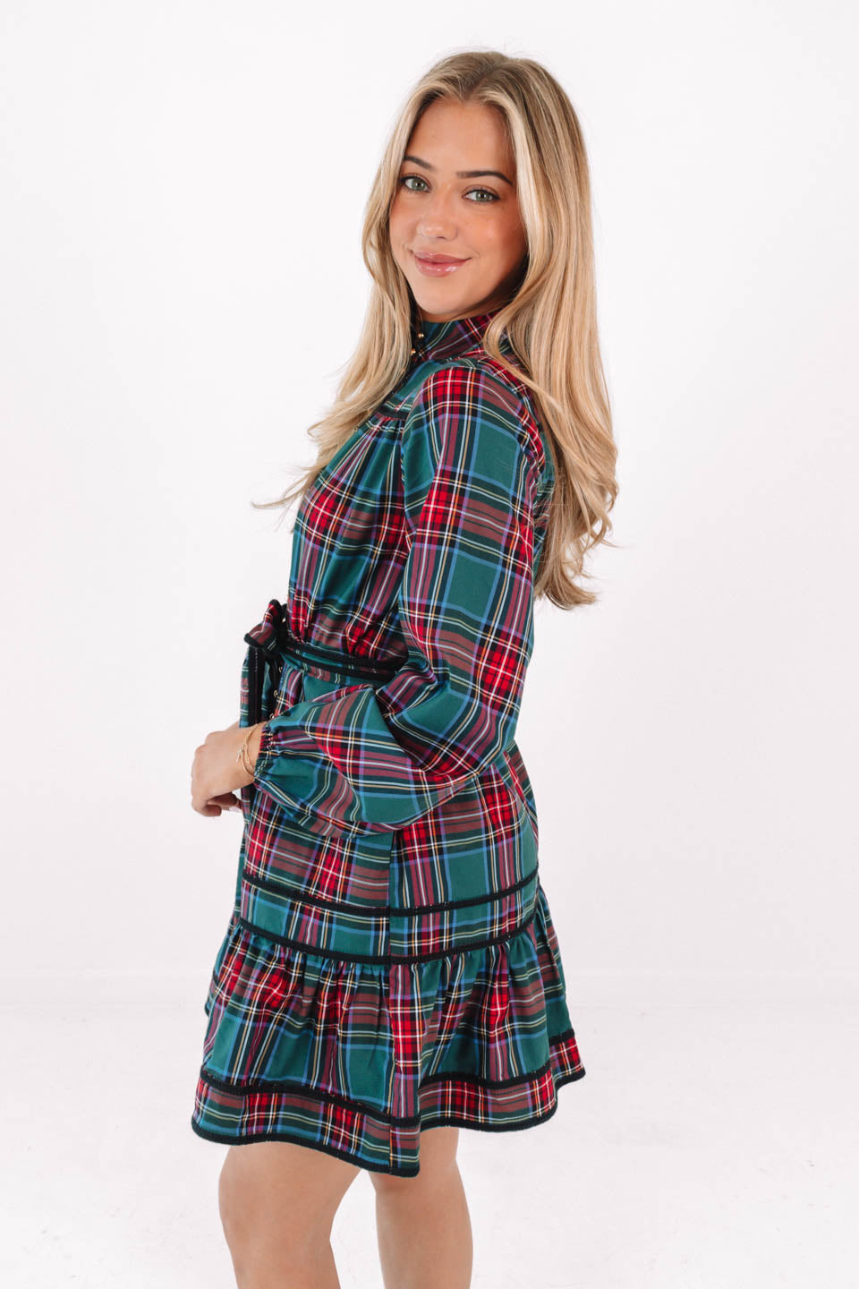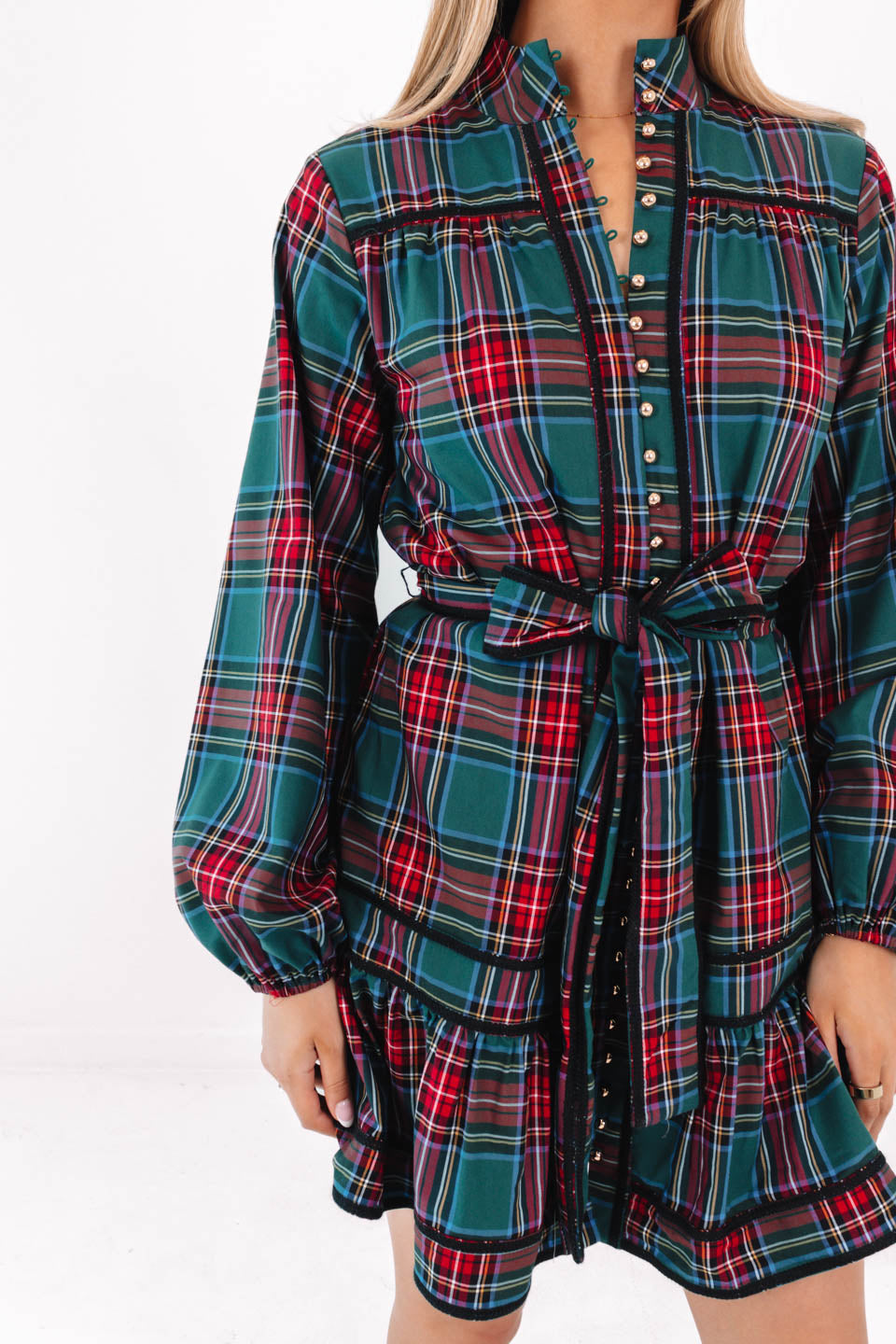 The Zanna Long Sleeve Tie Dress - Green Plaid
