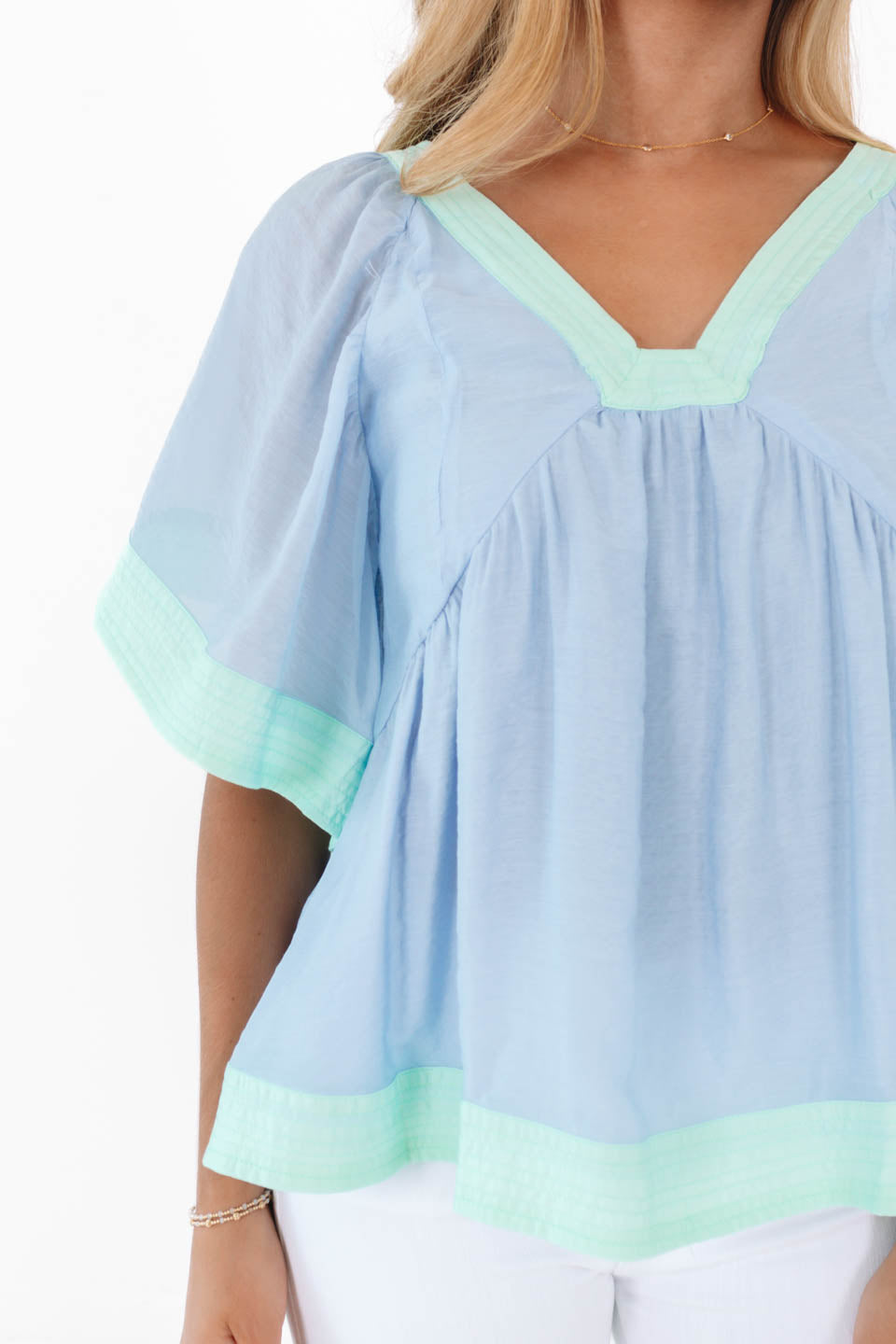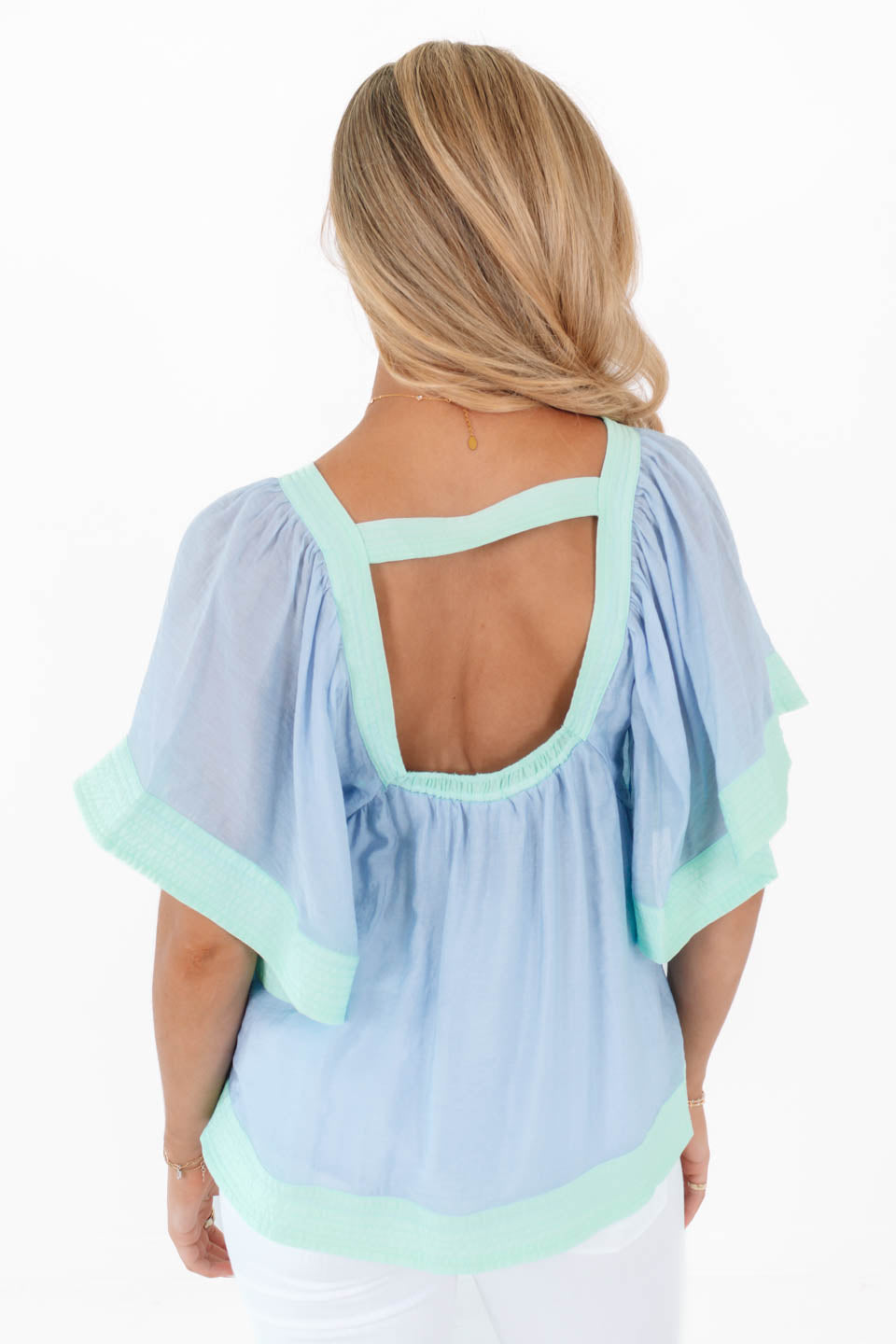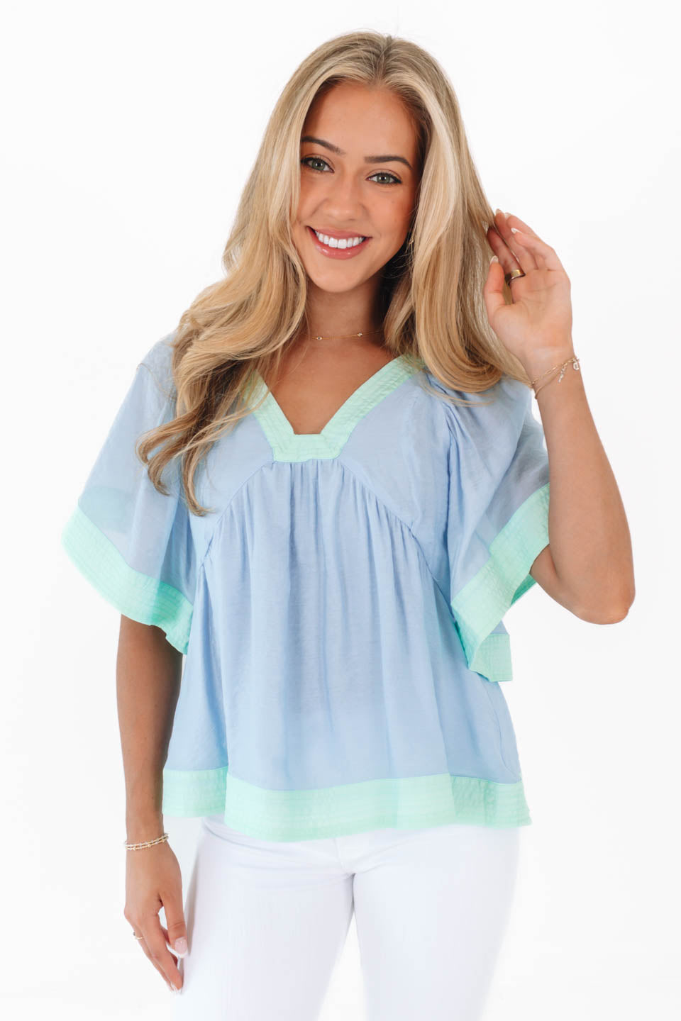 This powder blue and mint green top is giving all the sweet summer energy you need! With fluttery sleeves and breezy vibes, it’s perfect for twirling into brunch or soaking up sunshine. Pair it with your favorite denim and get ready to radiate happy-hour chic all day long!