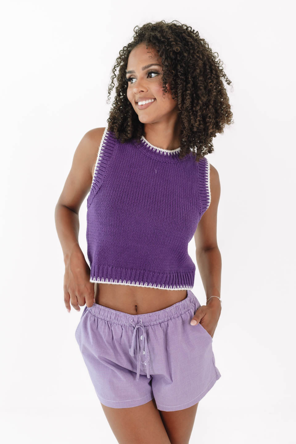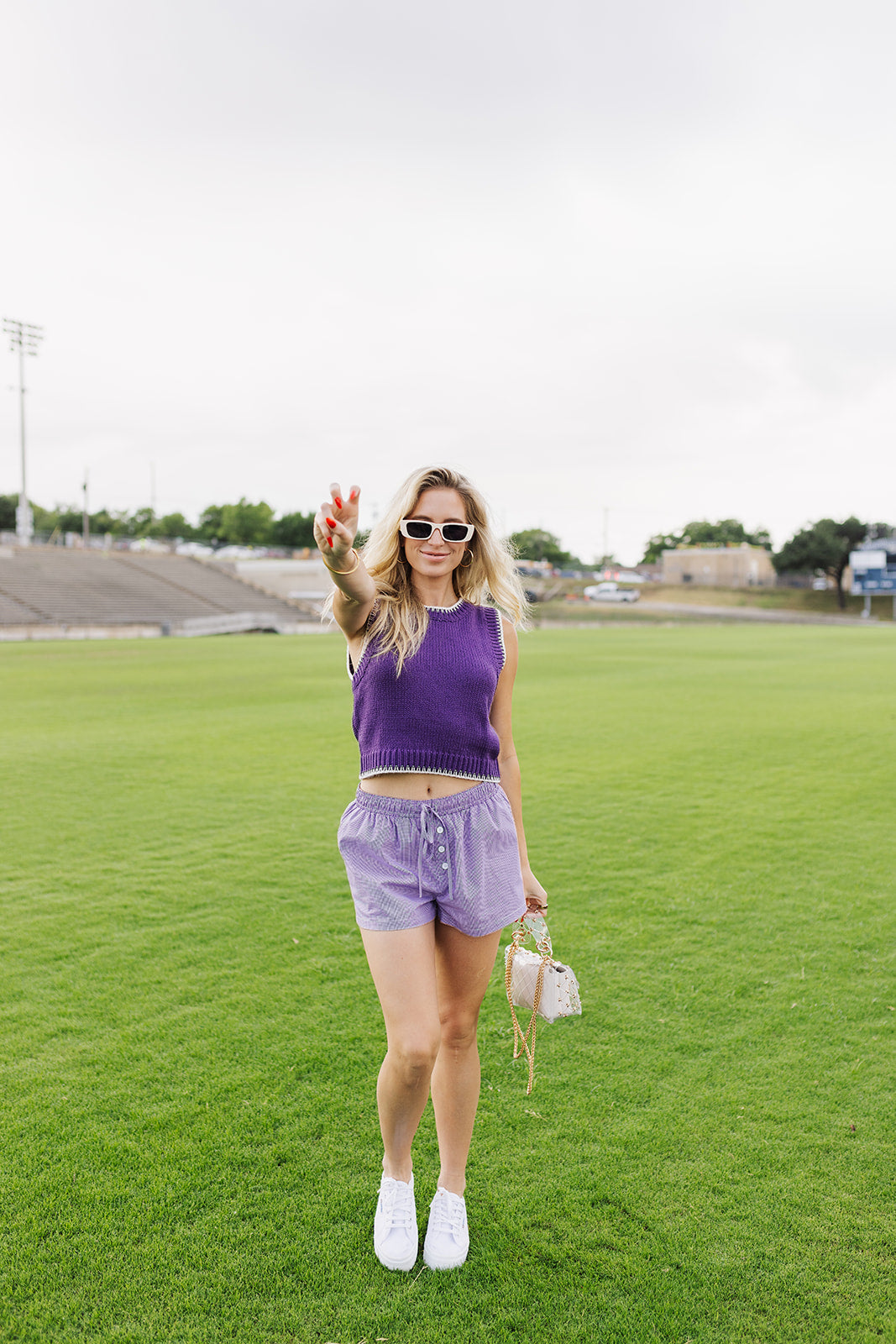 This varsity-inspired knit top is giving major pep rally energy with a side of retro charm. The bold purple and sporty white trim are perfect for repping your team in style. Toss it on for tailgates, study dates, or just feeling cute on campus!
