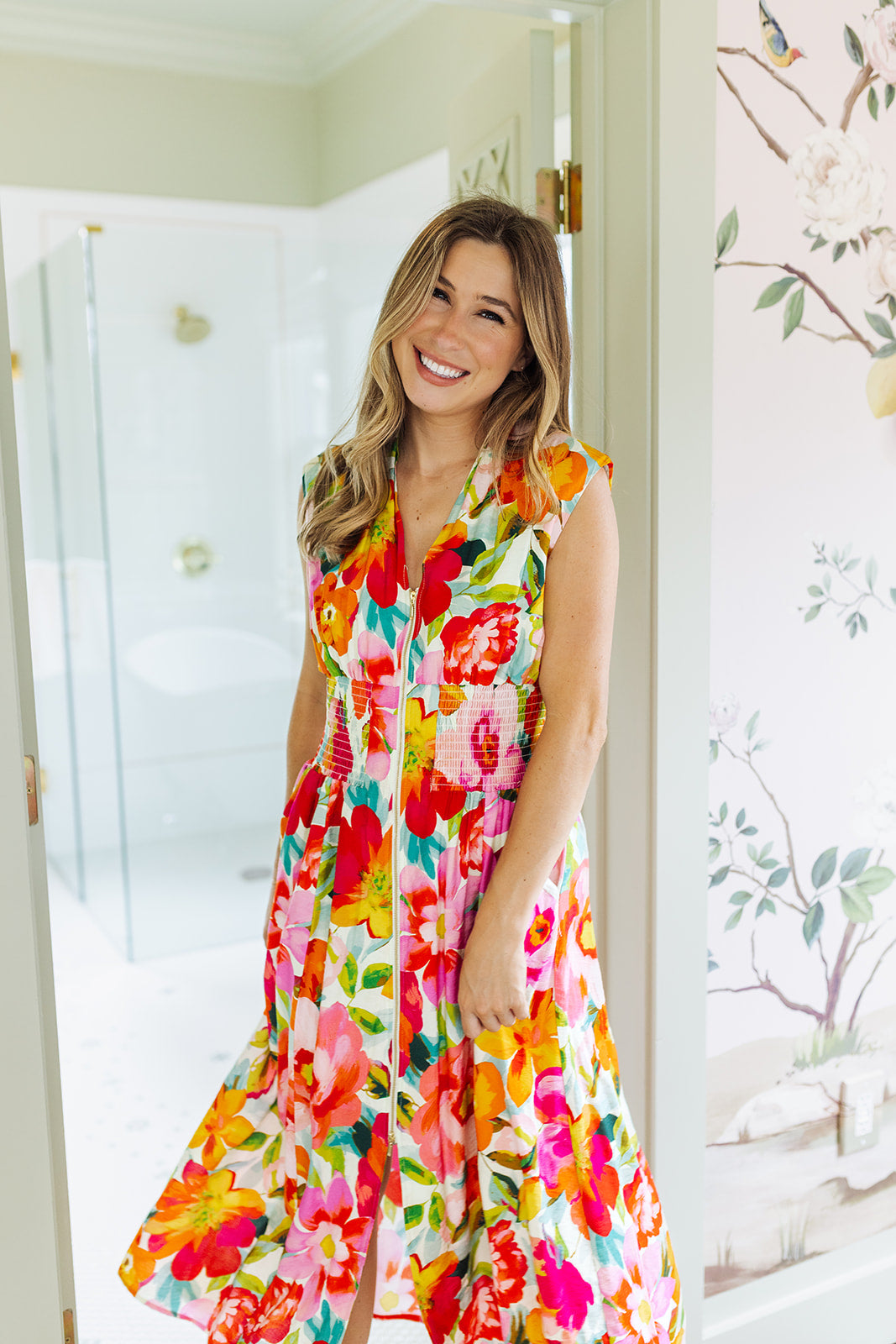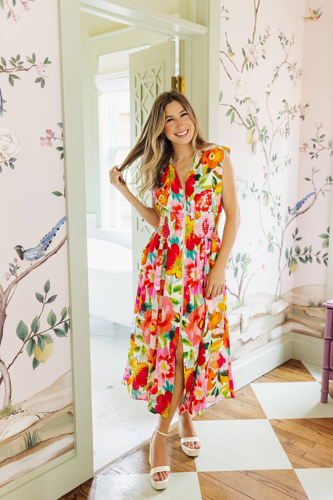 Turn heads in this bold and breezy floral midi, bursting with vibrant blooms and vacation energy. The flattering smocked waist and button-front detail add a touch of charm to this effortlessly chic look. Perfect for sunny strolls, tropical dinners, or just feeling fabulous in full color.