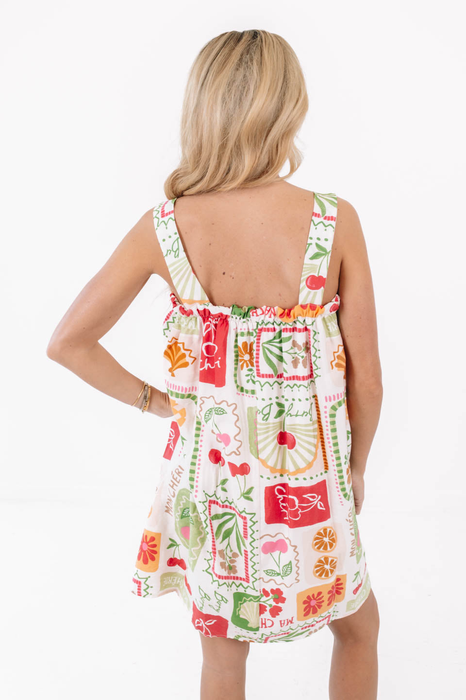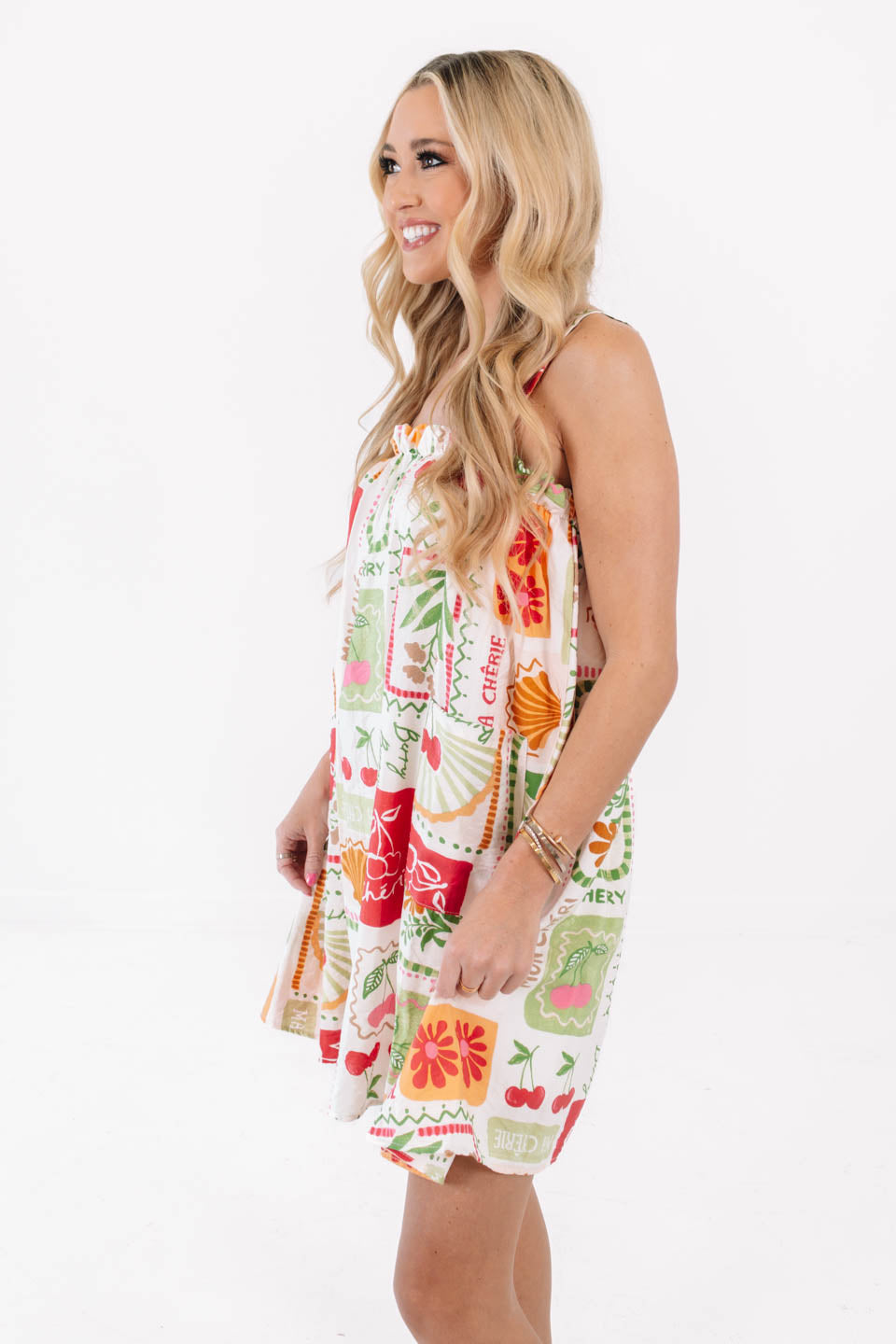 This breezy sundress is a summer dream come true, covered in a playful patchwork of fruity prints and whimsical garden-inspired designs. With roomy pockets and an effortless silhouette, it's perfect for poolside lounging or farmers' market strolls. Paired with those chic platform sandals, it's giving major retro-chic vibes with a modern, carefree twist!
