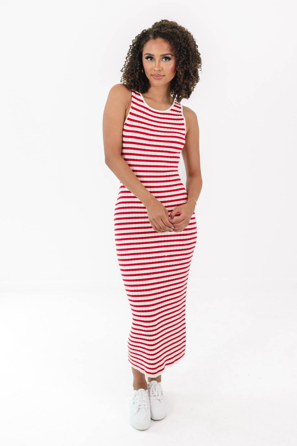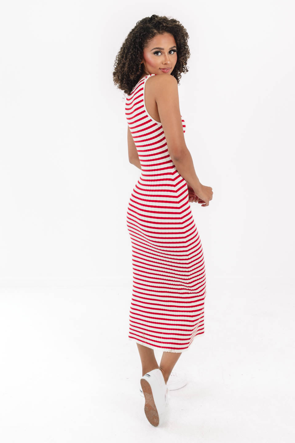 Bring on the fun in this bold red and white striped midi dress that’s as playful as it is flattering! The ribbed knit hugs your curves just right, making it perfect for sunny strolls or spontaneous dance breaks. Pair it with sneakers for a laid-back vibe or dress it up—this look does it all.