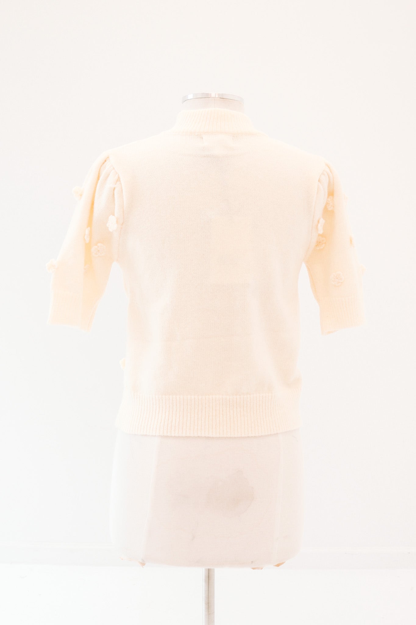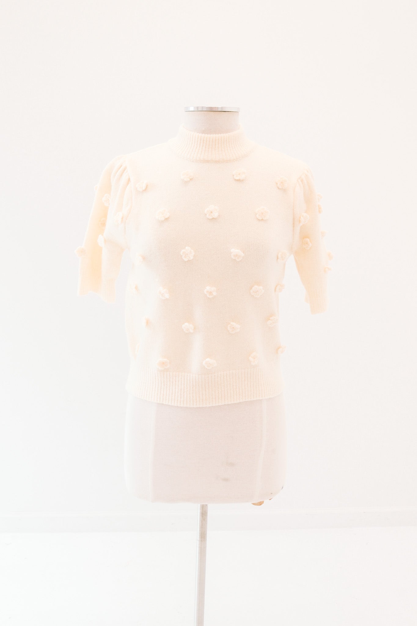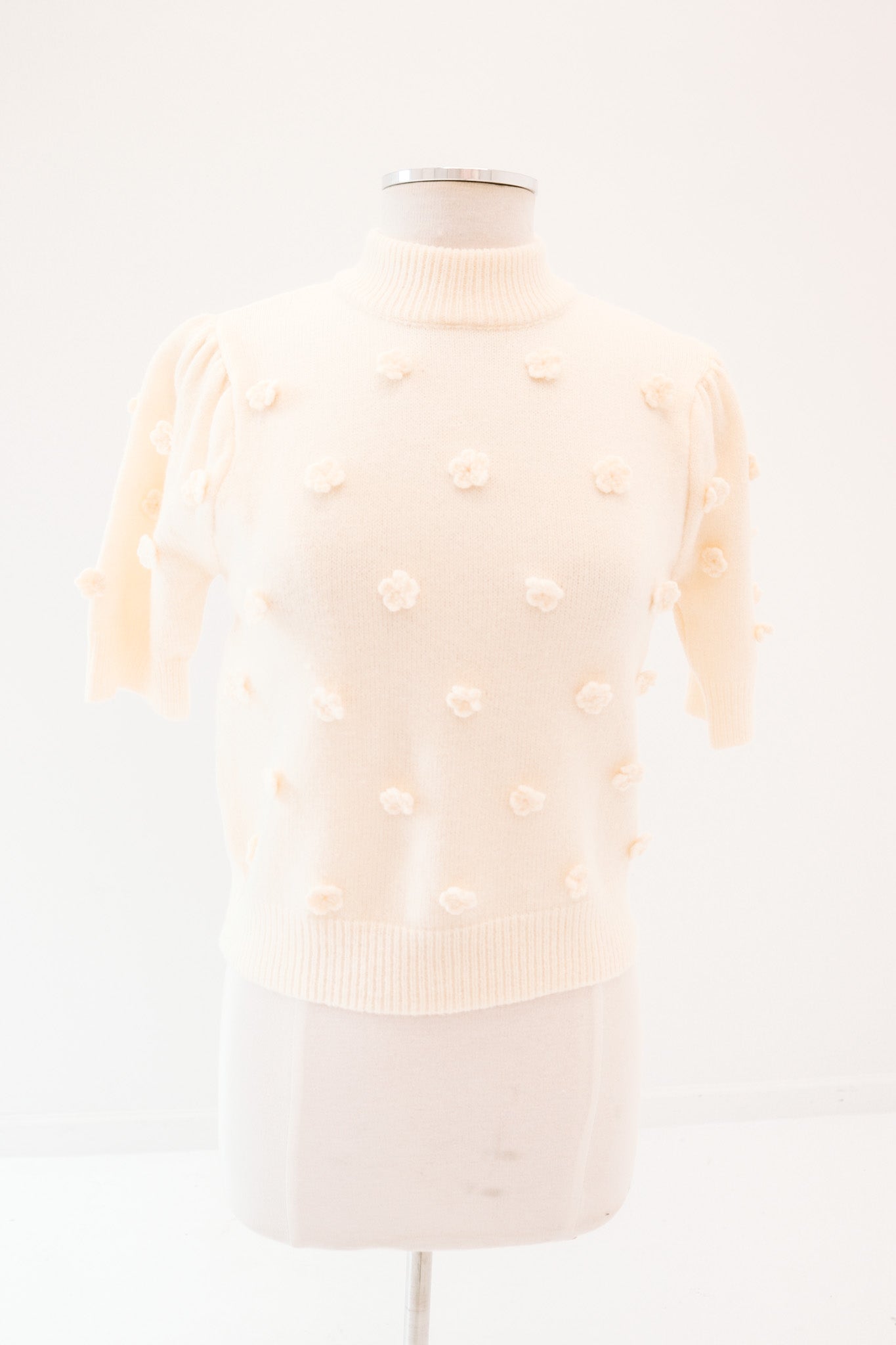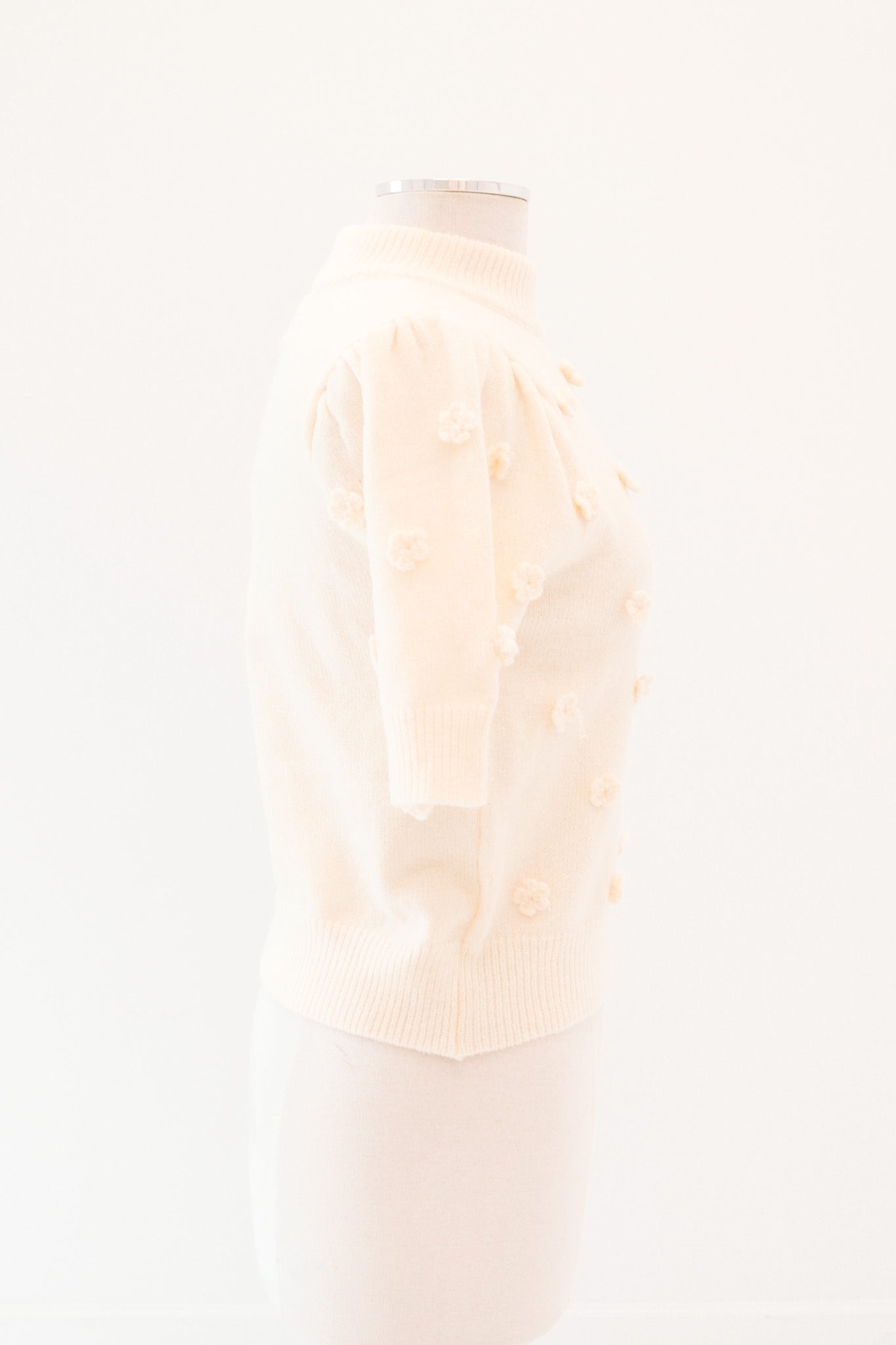 This cozy, ivory-colored sweater is the perfect blend of chic and playful, featuring adorable textured flower details that add a pop of personality. With its short puff sleeves and relaxed fit, it's ideal for transitioning between seasons in effortless style. Pair it with anything from a flirty skirt to your favorite jeans for a look that's equal parts comfy and cute!