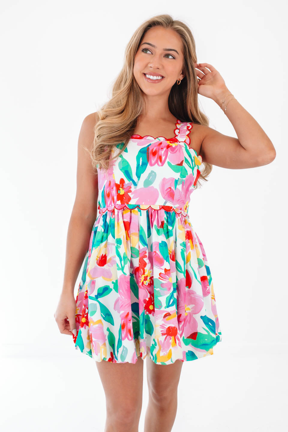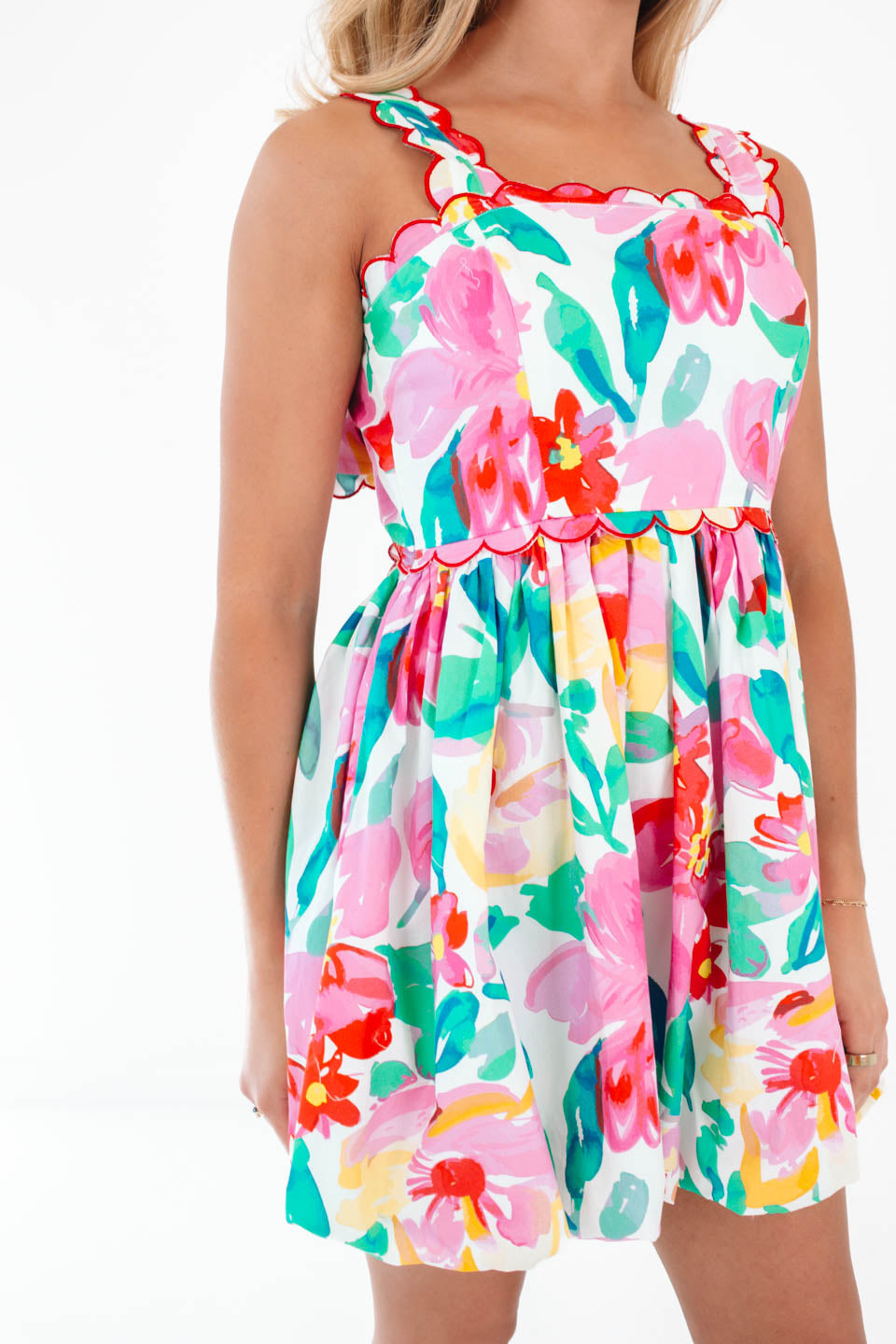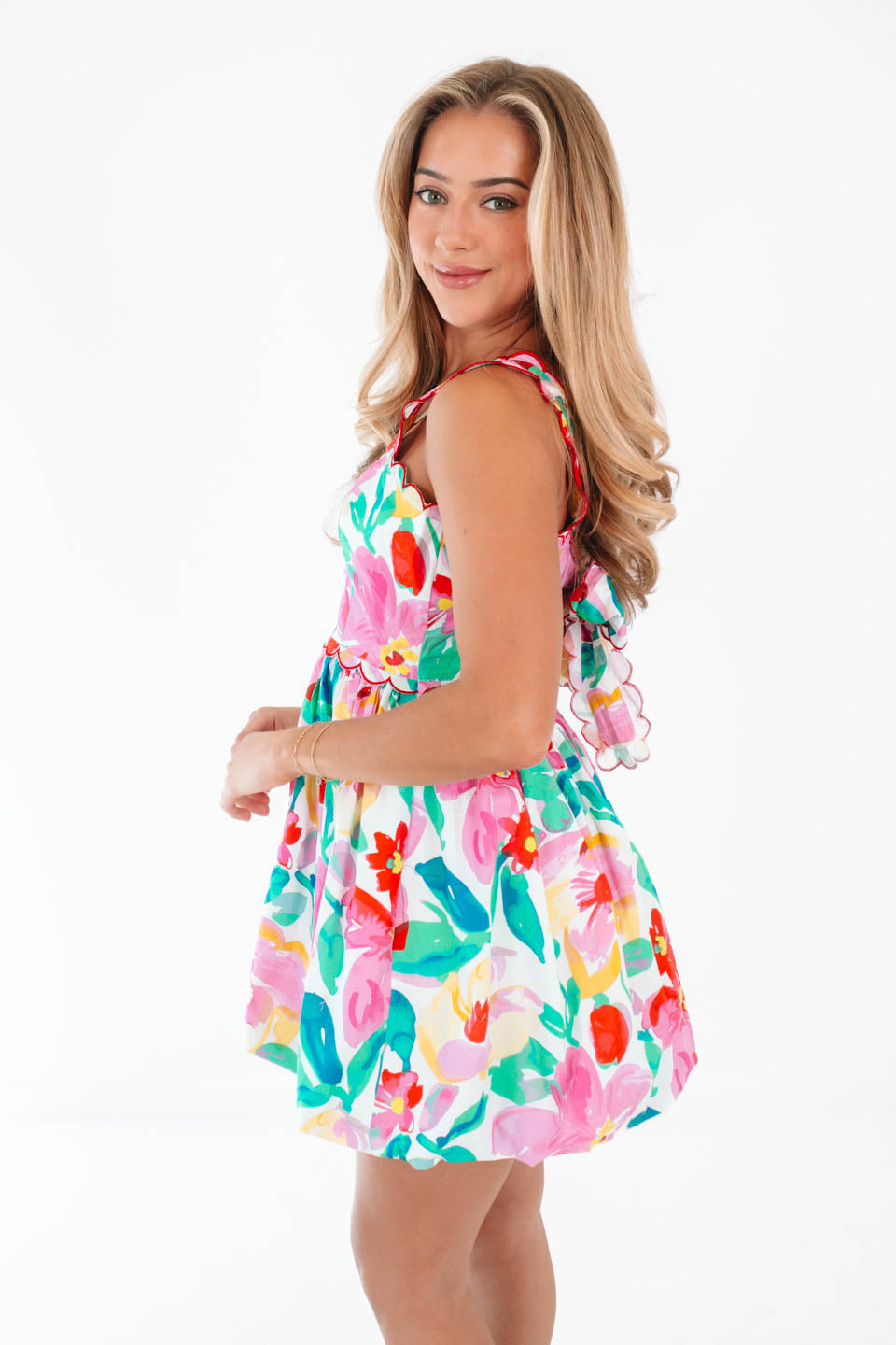 This floral mini dress is giving major picnic-in-the-park vibes with its adorable scalloped trim and breezy silhouette! The classic multicolored pattern adds a touch of vintage charm, while the playful straps make it perfect for twirling in the sunshine. Whether you're sipping lemonade or dancing under the stars, this dress is your new go-to for effortless summer fun!