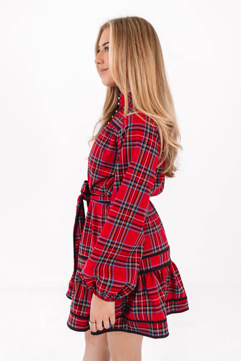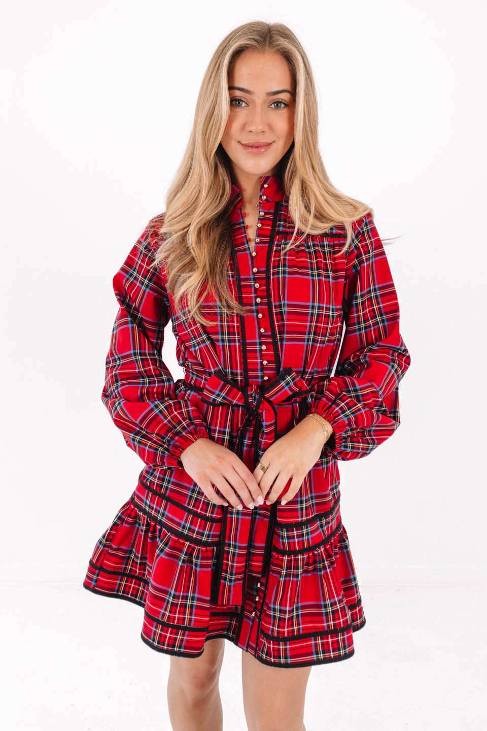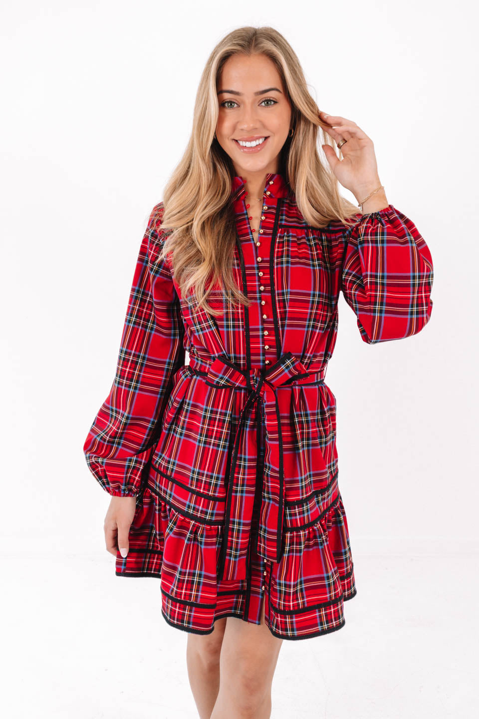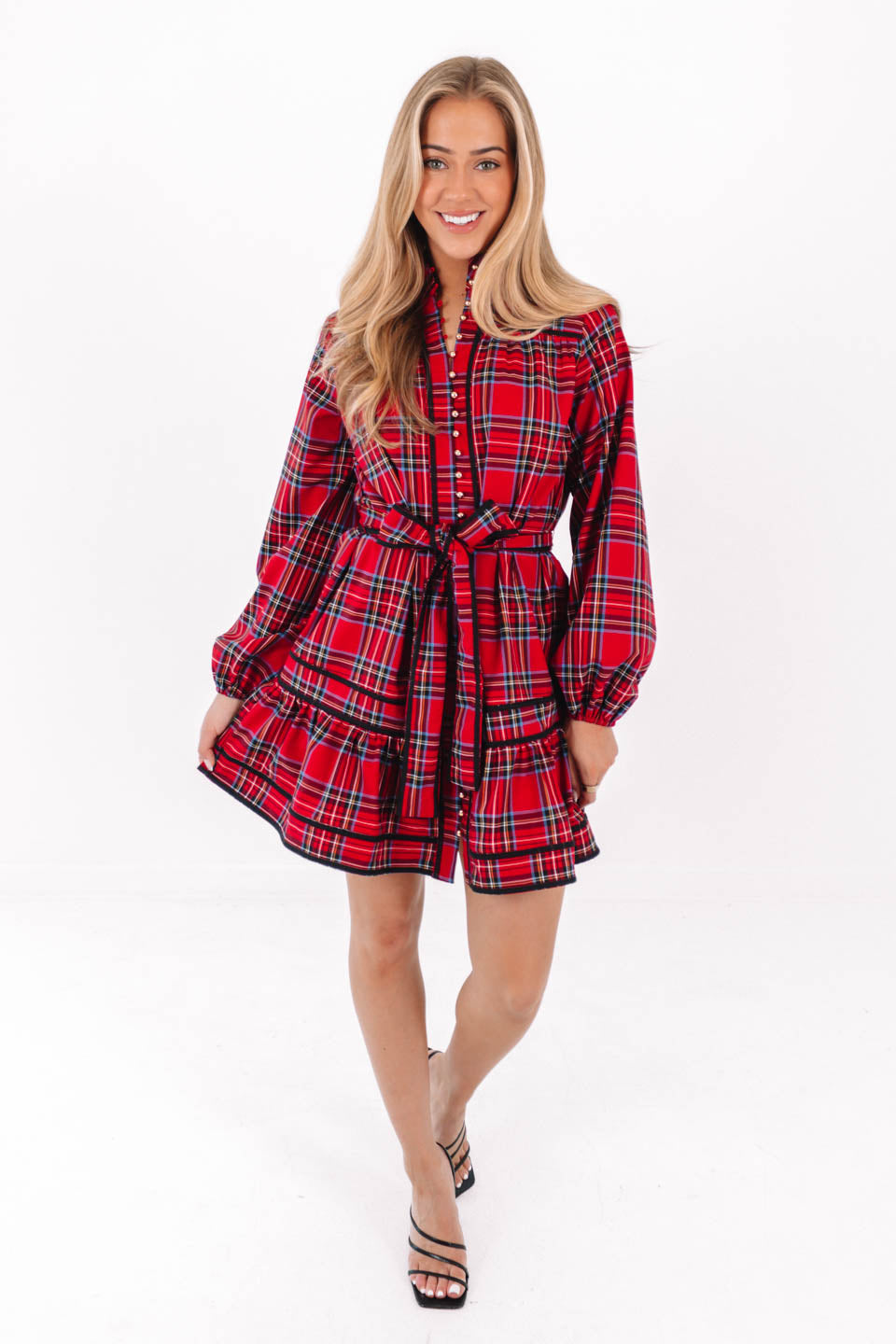 The Hollin Long Sleeve Tie Dress - Red Plaid