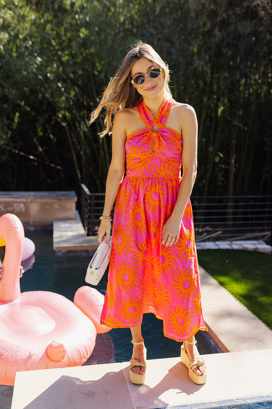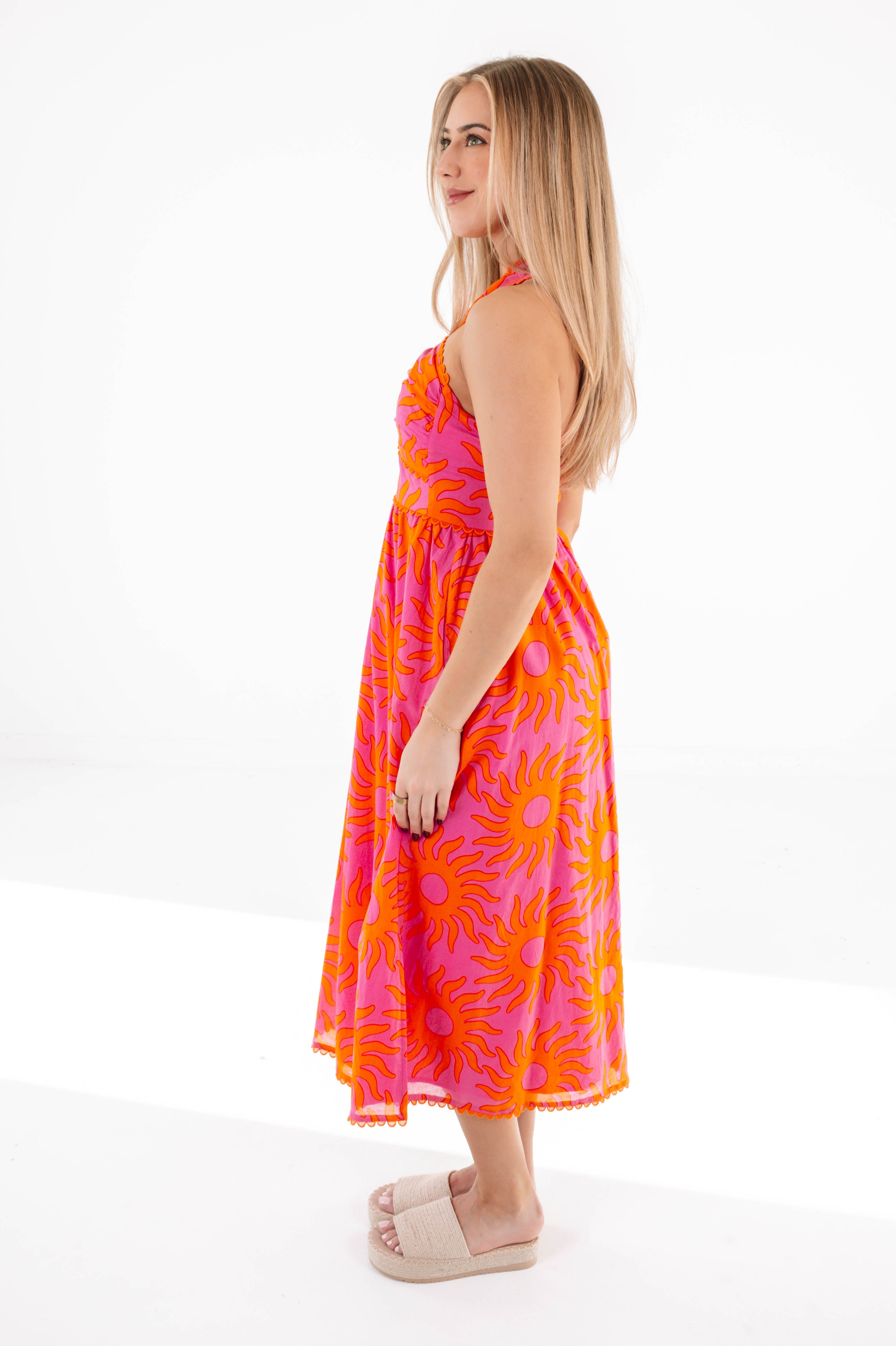 The Mara Ric Rac Tie Strap Midi Dress - Hot Pink