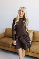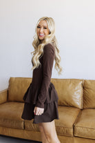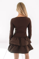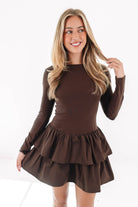 This chocolate-brown dress is sleek on top with a playful surprise at the bottom! The flouncy layered skirt brings a twirl-worthy flair to its simple, long-sleeve silhouette. It’s the perfect mix of chic and cheeky for any day-to-night adventure.