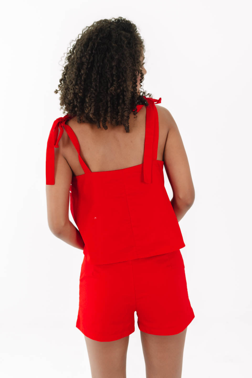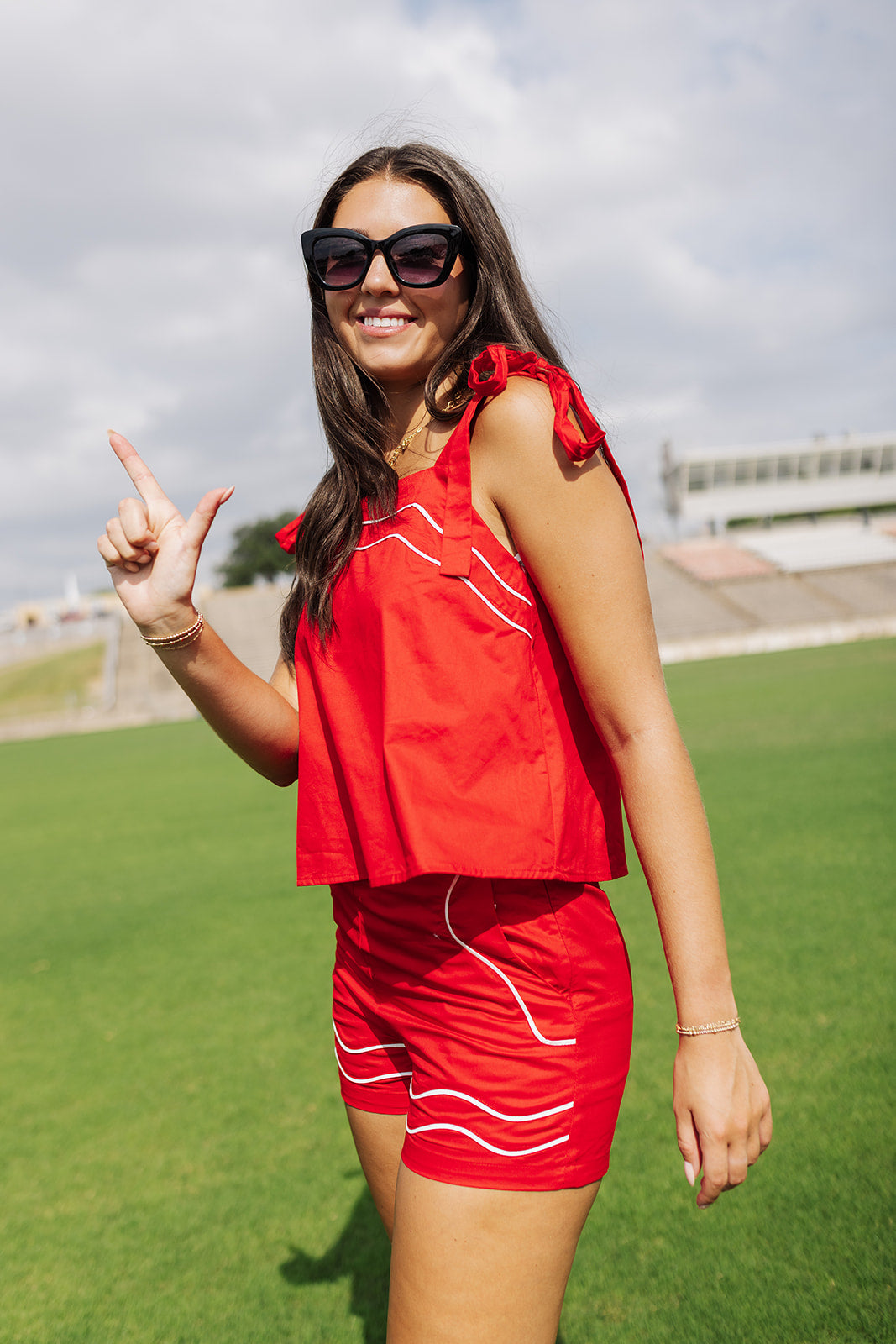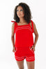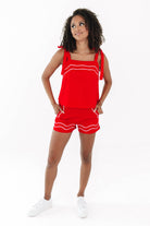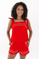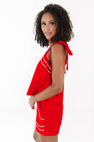 Bring the heat to tailgate season in this fiery red top with bold white piping and playful tie straps that scream school spirit. It's cute, comfy, and made for catching compliments in the stands or on the strip. Pair it with your favorite shades and you're instantly the MVP of game day style.