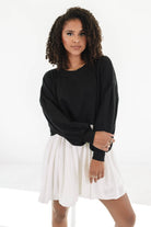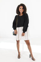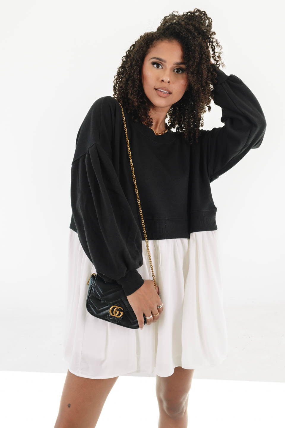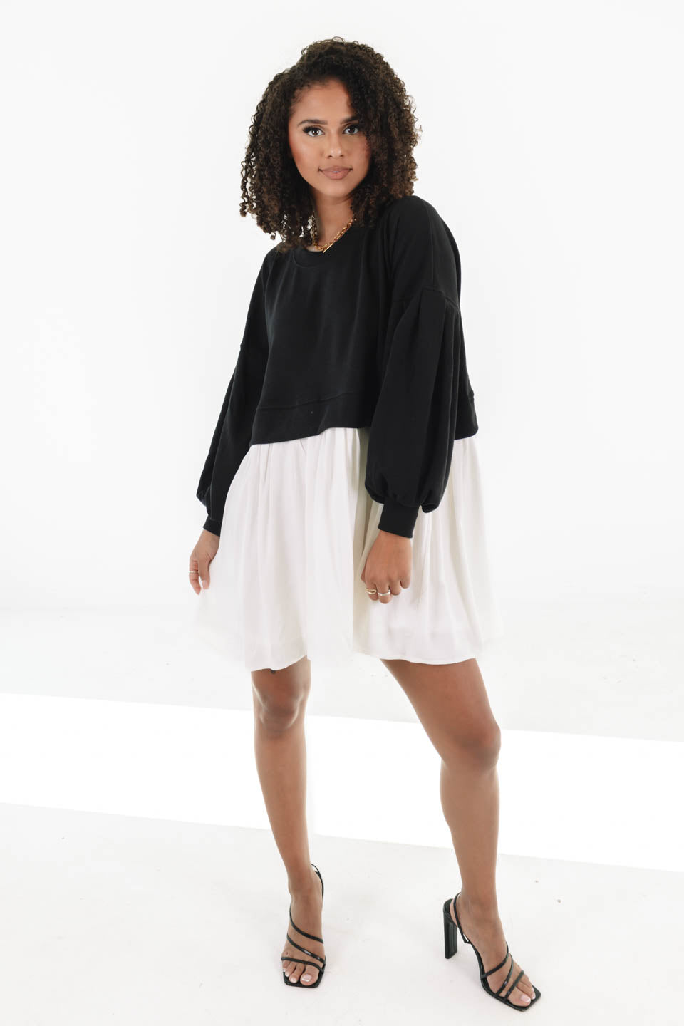 This playful dress combines comfort and style with a cozy black top and a breezy, flowy white bottom. The two-tone design is effortlessly cool, bringing together casual and chic in one perfect outfit. Toss on your favorite sneakers or ankle boots, and you've got a look that's both laid-back and lively!