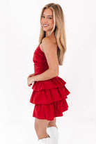 Bold, bright, and full of energy, this strapless ruffle mini dress is made for making a statement! The vibrant crimson hue and layered ruffles bring all the fun, whether you're hitting the dance floor or celebrating a sunny day. Just add heels and confidence, and you’re set to steal the show!