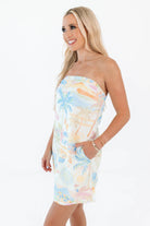 This strapless stunner is a beachside daydream, featuring a tropical print that feels like a vacation in dress form. With sunny pastels, palm trees, and pockets (yes, pockets!), it’s the perfect mix of carefree and chic. Just add sandals and a piña colada—paradise is calling!