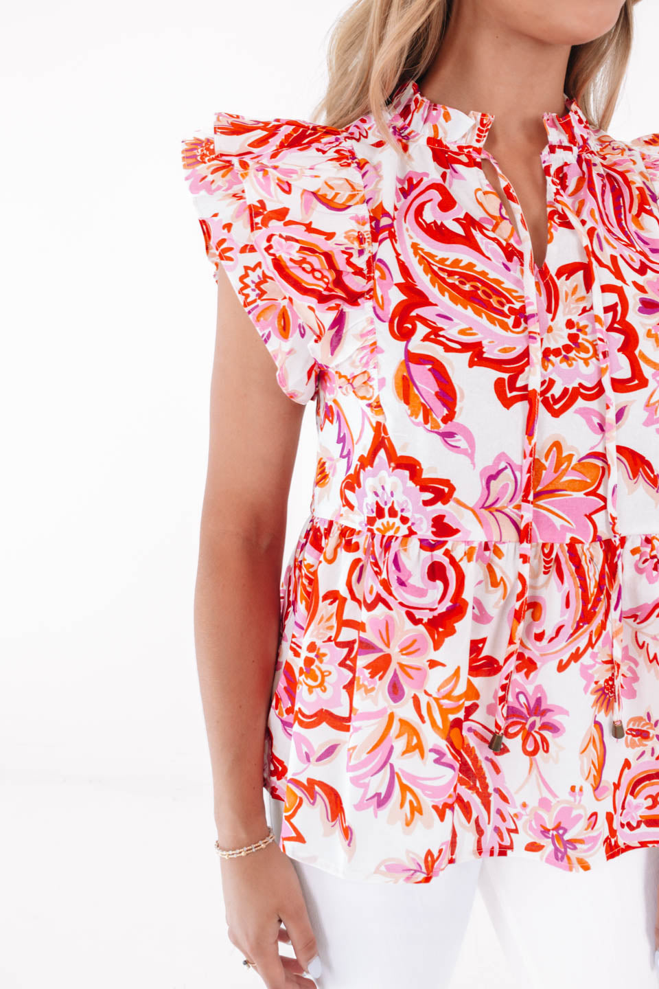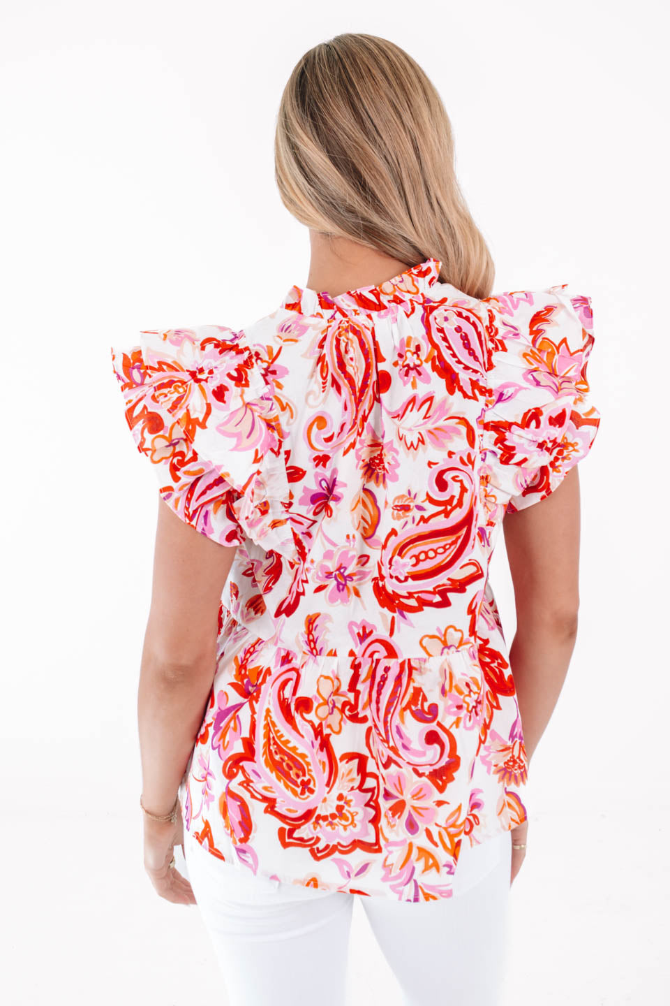 This vibrant, ruffle-sleeved top is a walking burst of sunshine with its bold paisley florals and fiery pink-orange palette. It's giving picnic-in-the-park meets rooftop brunch energy, and we’re here for it. Just add white jeans and a smile—instant mood booster achieved!