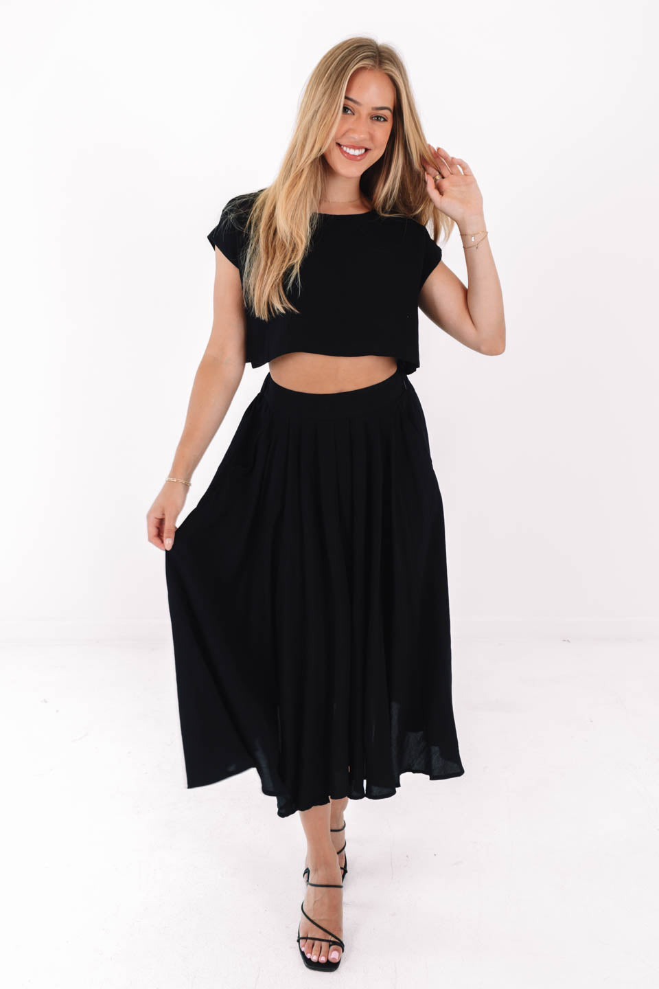 This cropped black tee is your new style MVP—simple, sleek, and totally versatile. With its boxy fit and relaxed sleeves, it brings laid-back vibes with a trendy twist. Pair it with anything high-waisted and you're instantly cool-girl approved!