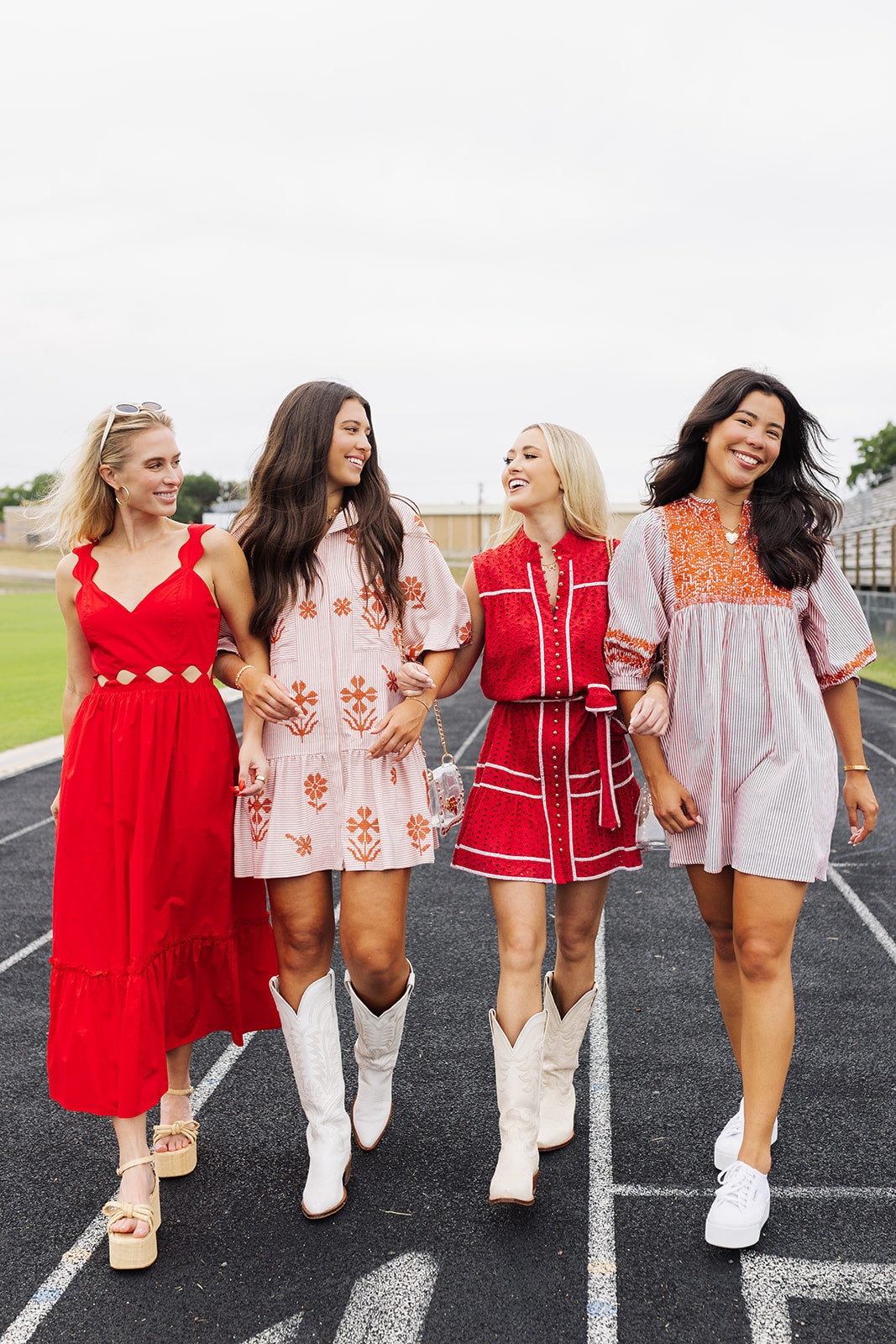 This lovely white dress features a soft light blue floral print and with an embroidered lining that adds a touch of elegance. With an adjustable tie for the perfect fit, gold buttons for the perfect shine, and a sleeveless look, it’s a fresh and feminine choice for warm-weather outings and special occasions.