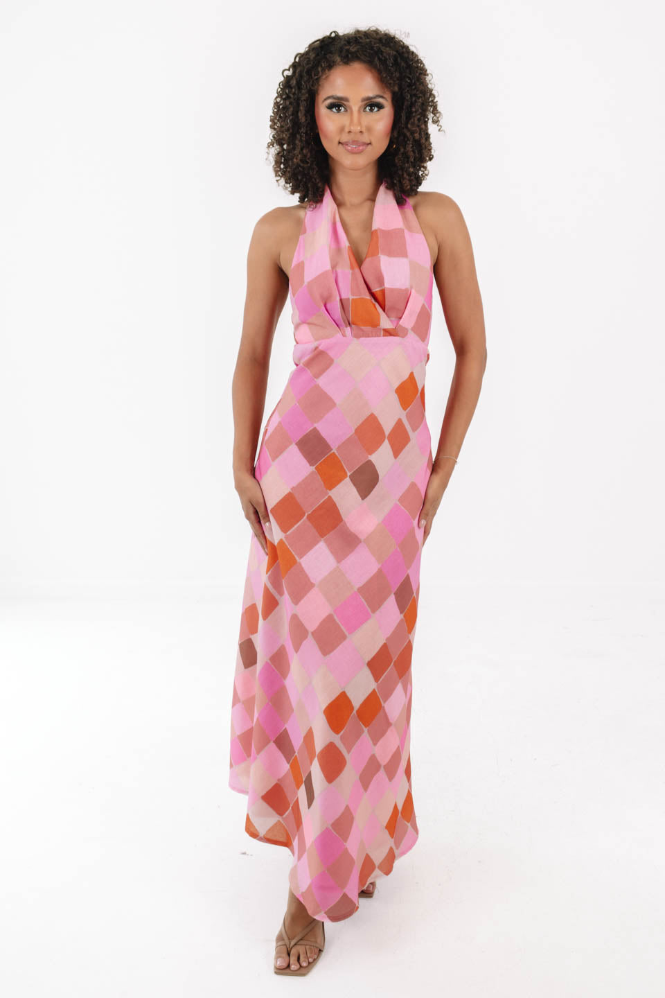 Get ready to dazzle in this vibrant, retro-inspired maxi dress, where a playful patchwork of pinks and oranges brings a burst of sunshine to your look! With its elegant halter neckline and flowing silhouette, it's perfect for dancing the night away or turning any day into a celebration. Just add a smile and your favorite sandals, and you're set for instant radiance!
