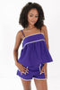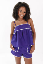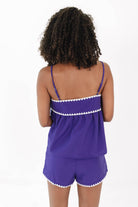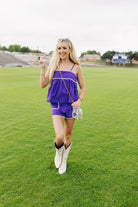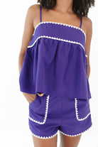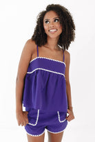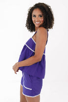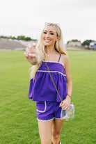 This flouncy purple top is ready to cheer you on from the tailgate to the stands, with playful white ric-rac trim that gives it a spirited, retro vibe. Its breezy fit keeps you cool while showing off your team pride in style. Pair it with matching shorts or denim and you’ve got the ultimate game day look—go team!
